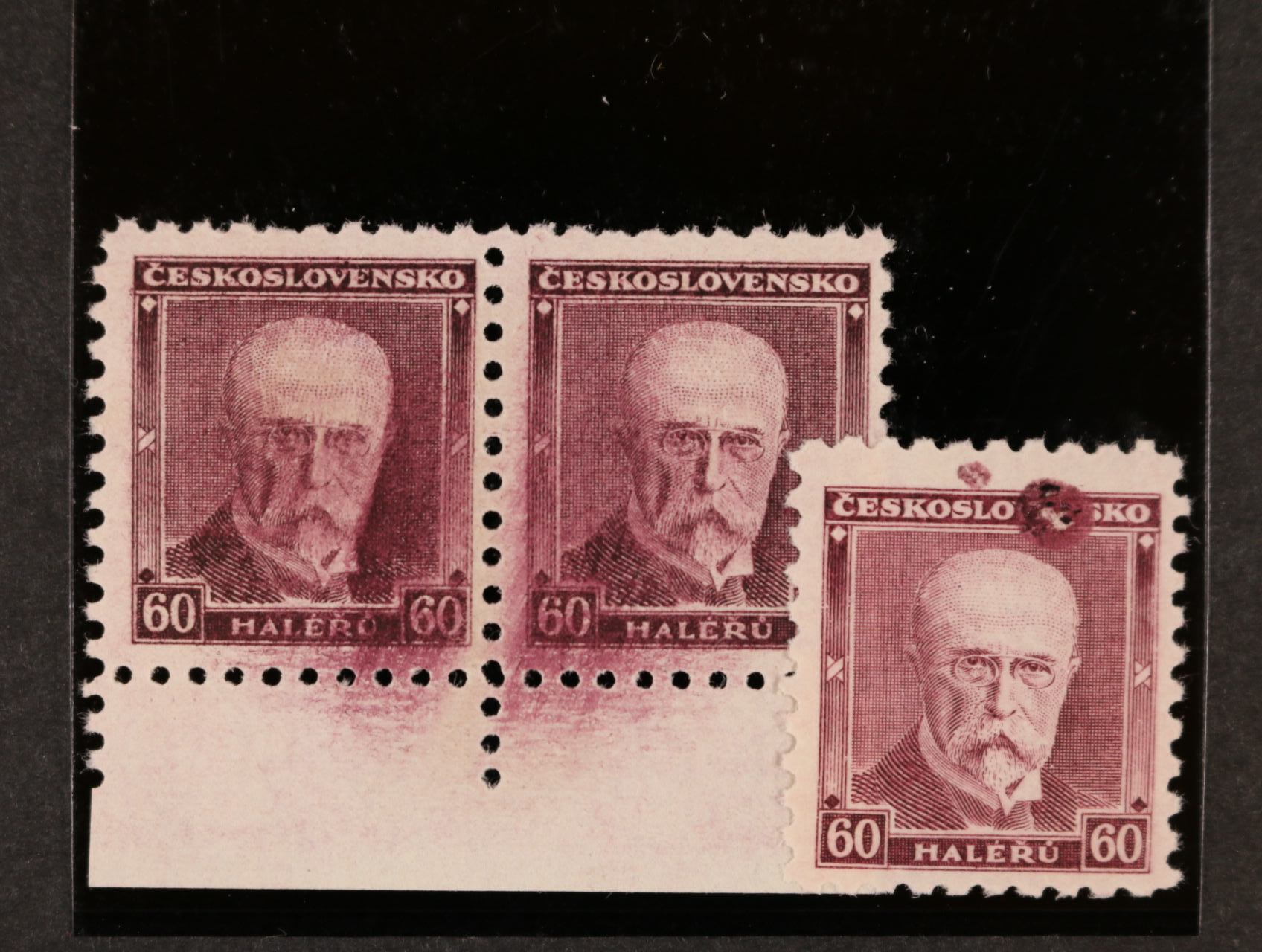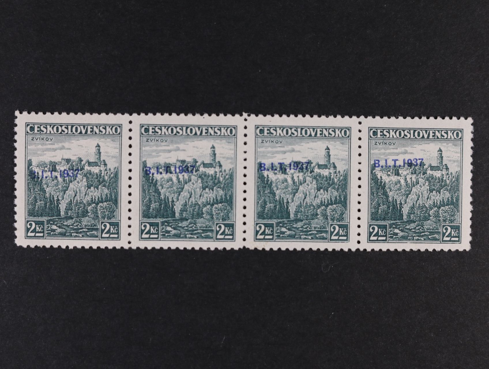 zn. č. 328 ve vodorovné čtyřpásce s výrazně šikmým přetiskem, 3 zn. svěží