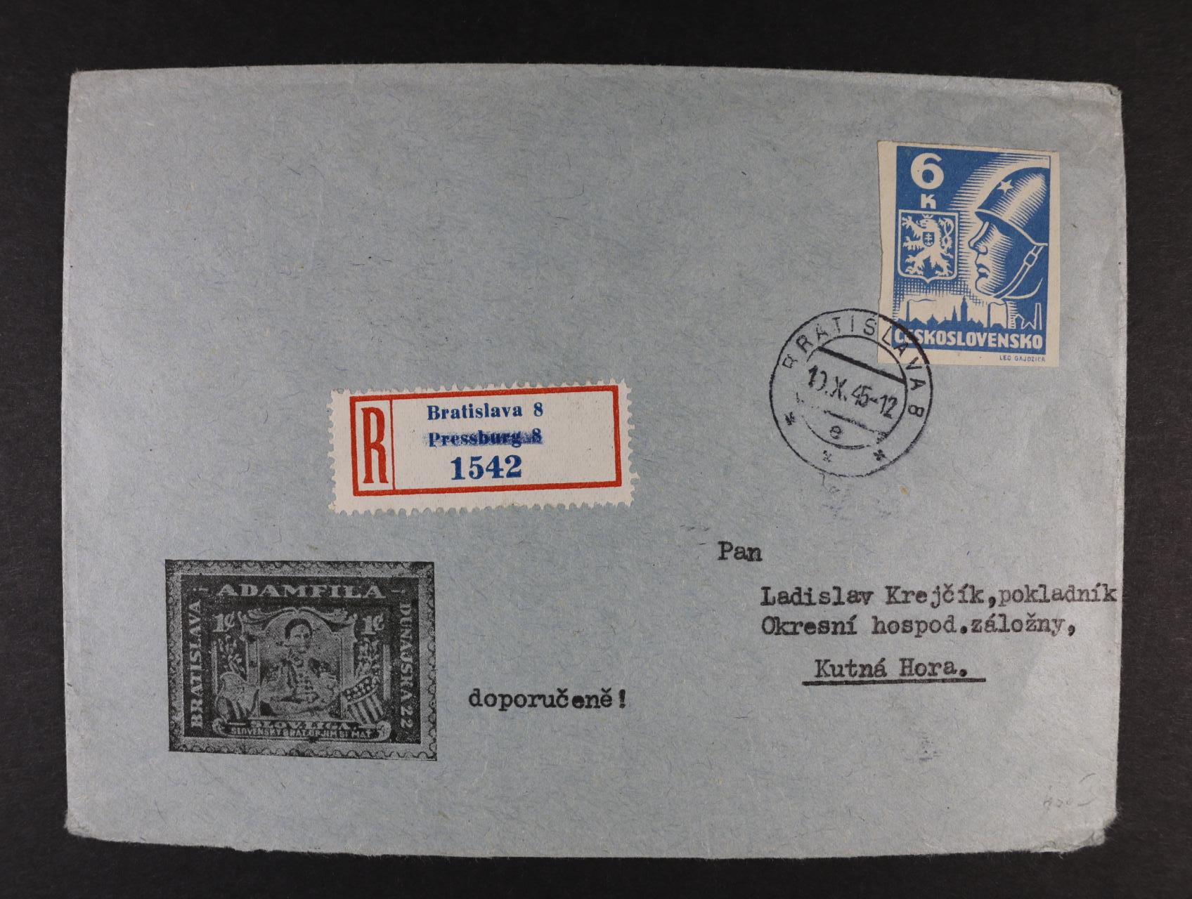 R-dopis do Kutné Hory frank. zn. č. 356, pod. raz. BRATISLAVA 10.10.45, přích. raz.