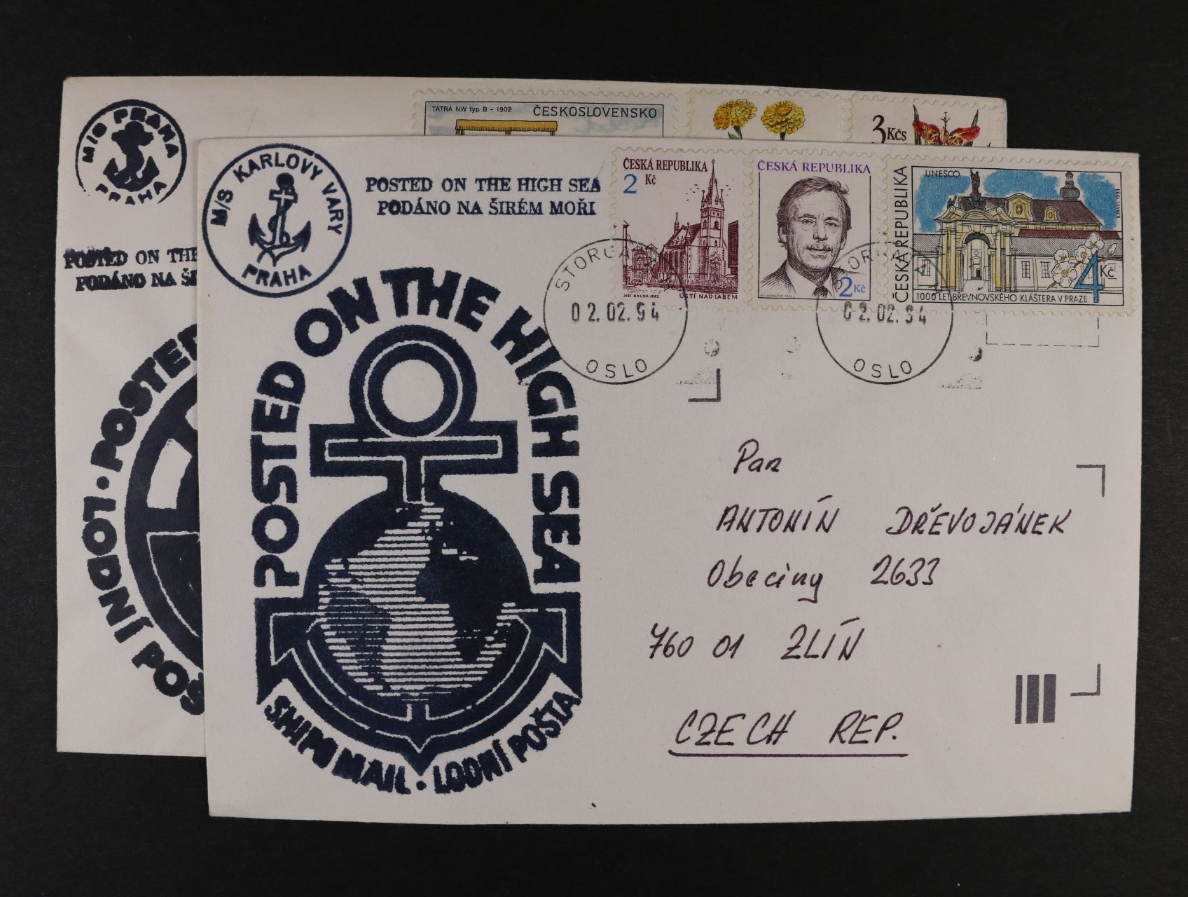 dva dopisy z r. 1992 a 1994 odeslané do ČSR z lodí MS PRAHA resp. KARLOVY VARY, na obou dvojjazyčné řádkové raz. PODÁNO NA ŠIRÉM MOŘI + lodní kašety, zajímavé