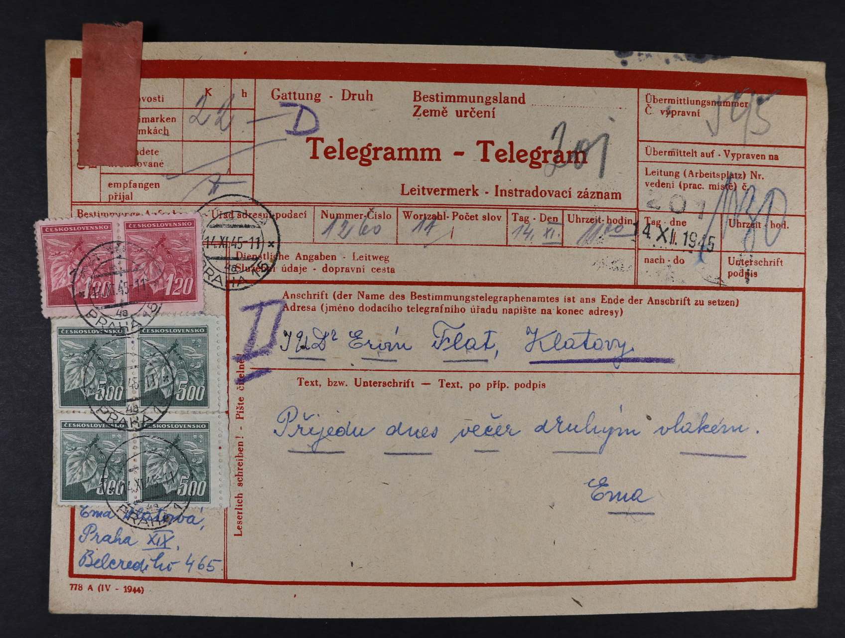 protektor. dvojjazyčný telegram do Topolčan frank. na zadní straně zn. č. 378 ve dvoupásce a zn. č. 379 v 6ti-pásce, pod. znárodněné raz. PRAHA 15 13.11.45
