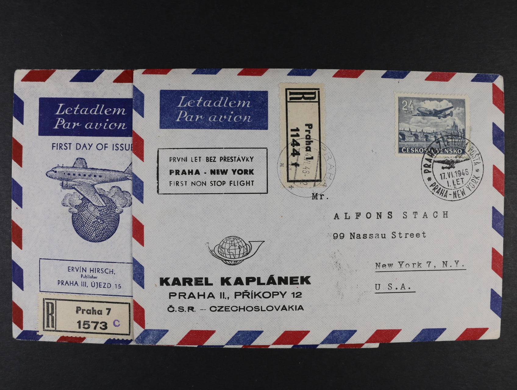 sestava prvních letů (3x Nev York), různé přítisky na obálkách, raz. 1. letu 17.4.46, 1. let Praha - Bombay s raz. 10.2.48, 1. let Praha - Beyrouth s raz. 21.7.48, 1. let Praha - Vídeň s raz. 15.9.50 + 1. noční let Praha - Bratislava s raz. 15.6.52