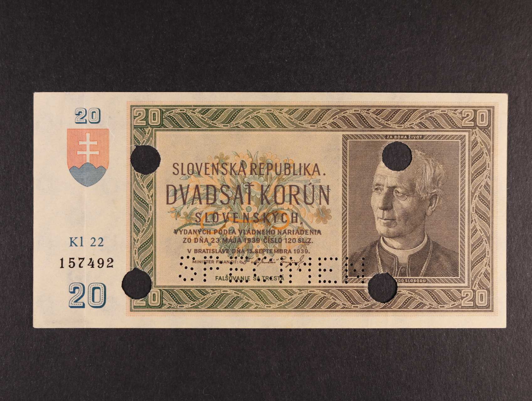 2055 20 Ks 15.9.1939 série Kl 22 s perf. SPECIMEN + 4x skartační otvory, Ba. 47b, Pi. 5s 1500