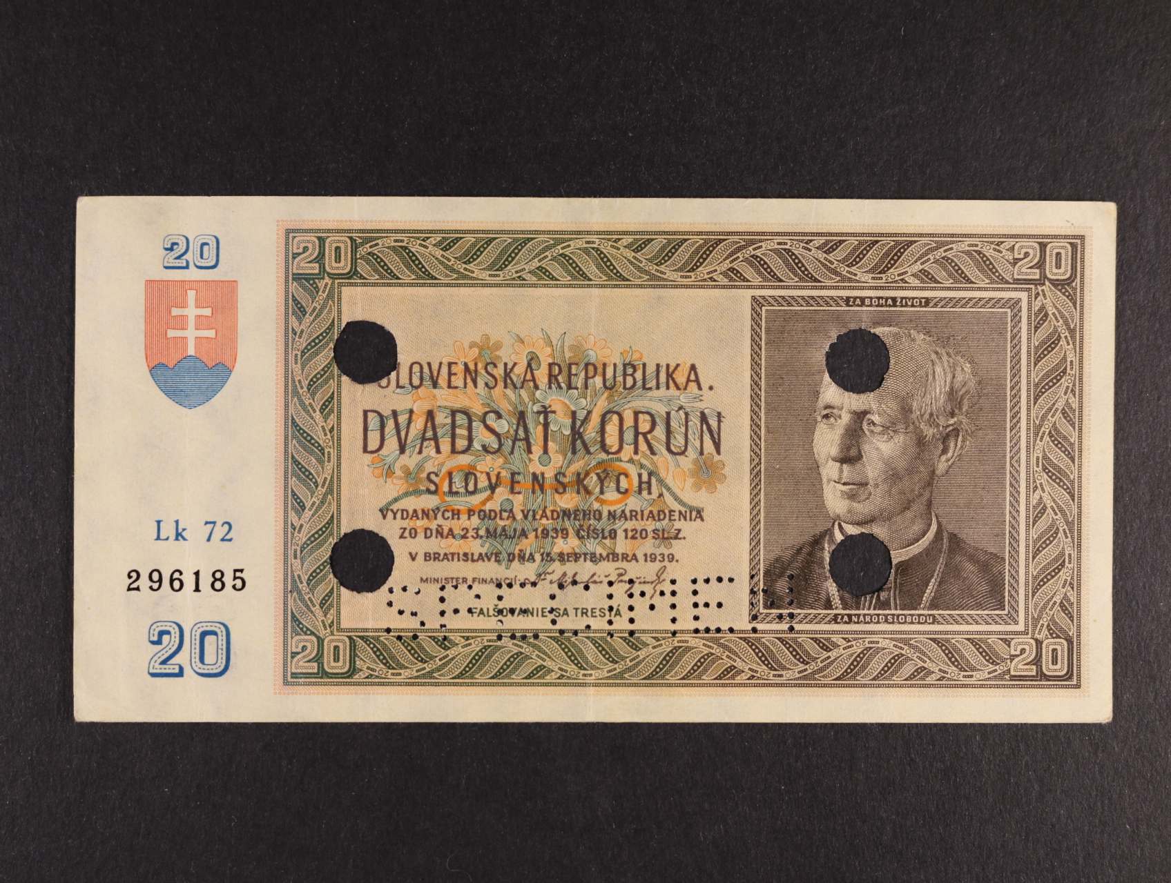 2056 20 Ks 15.9.1939 série Lk 72 s perf. SPECIMEN + 4x skartační otvory, Ba. 47b, Pi. 5s 1200
