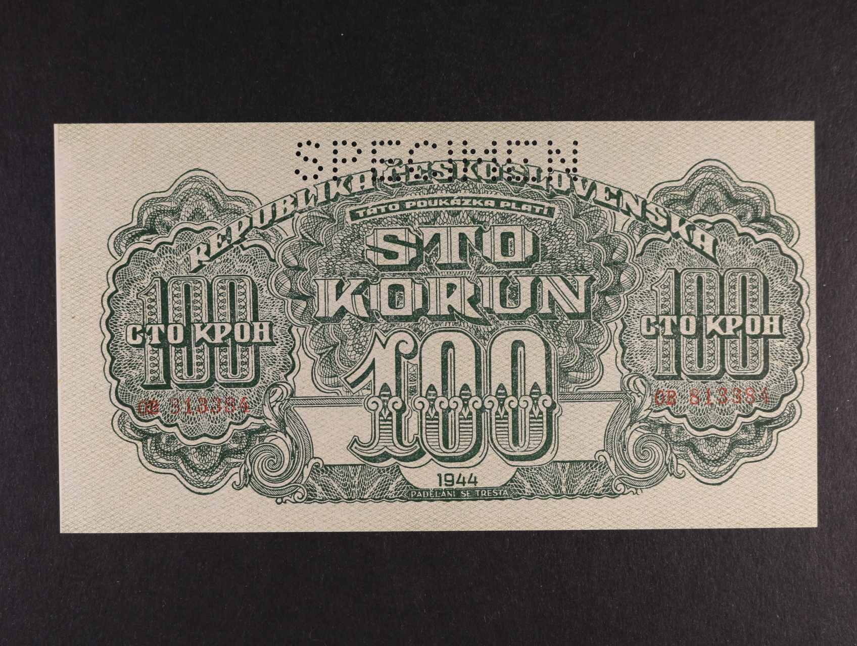500 K 1944 série AO kolkovaná, bankovní vzor s 4x vodorovnou perf. SPECIMEN, Ba. 67, Pi. 55s