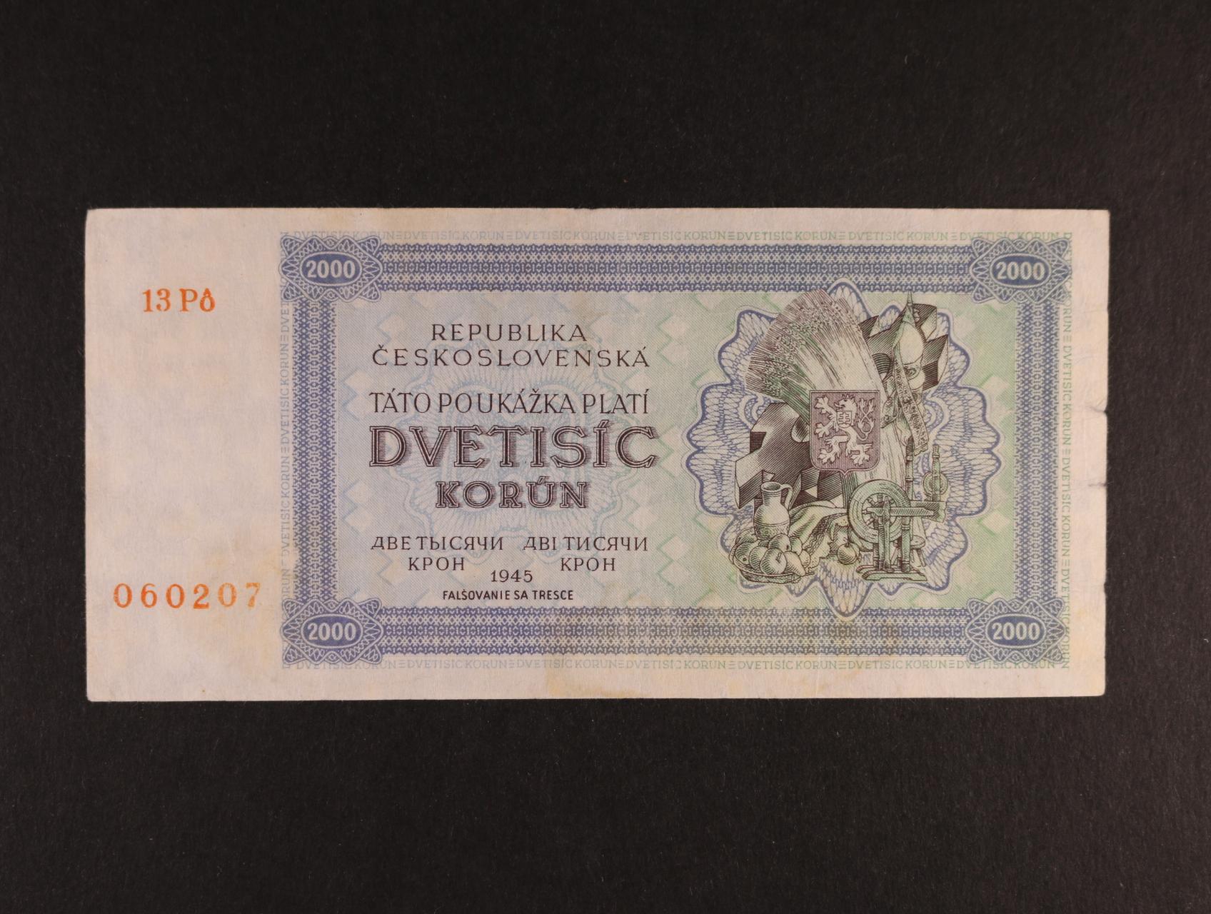 2000 K 1945 série 13 Pó poukázka, poloha vodoznaku A, neperforovaná, vzácná, Ba. 69b, Pi. 50Aa, poškozená v pravém okraji