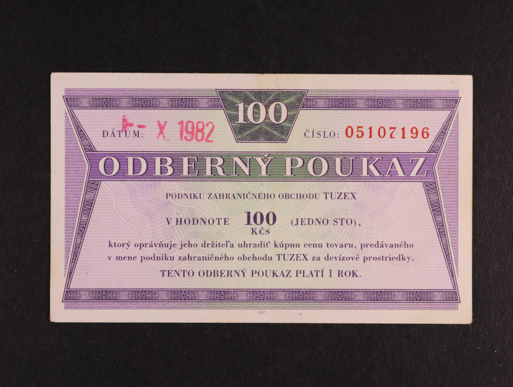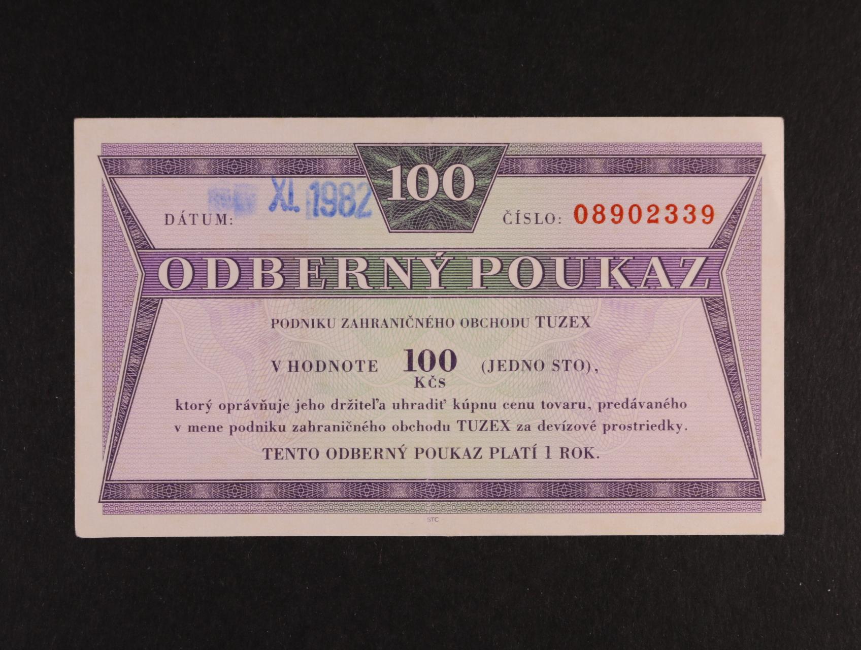 Tuzex, 100 TKčs s raz. X.1982, K.Š.K. 61/VIII