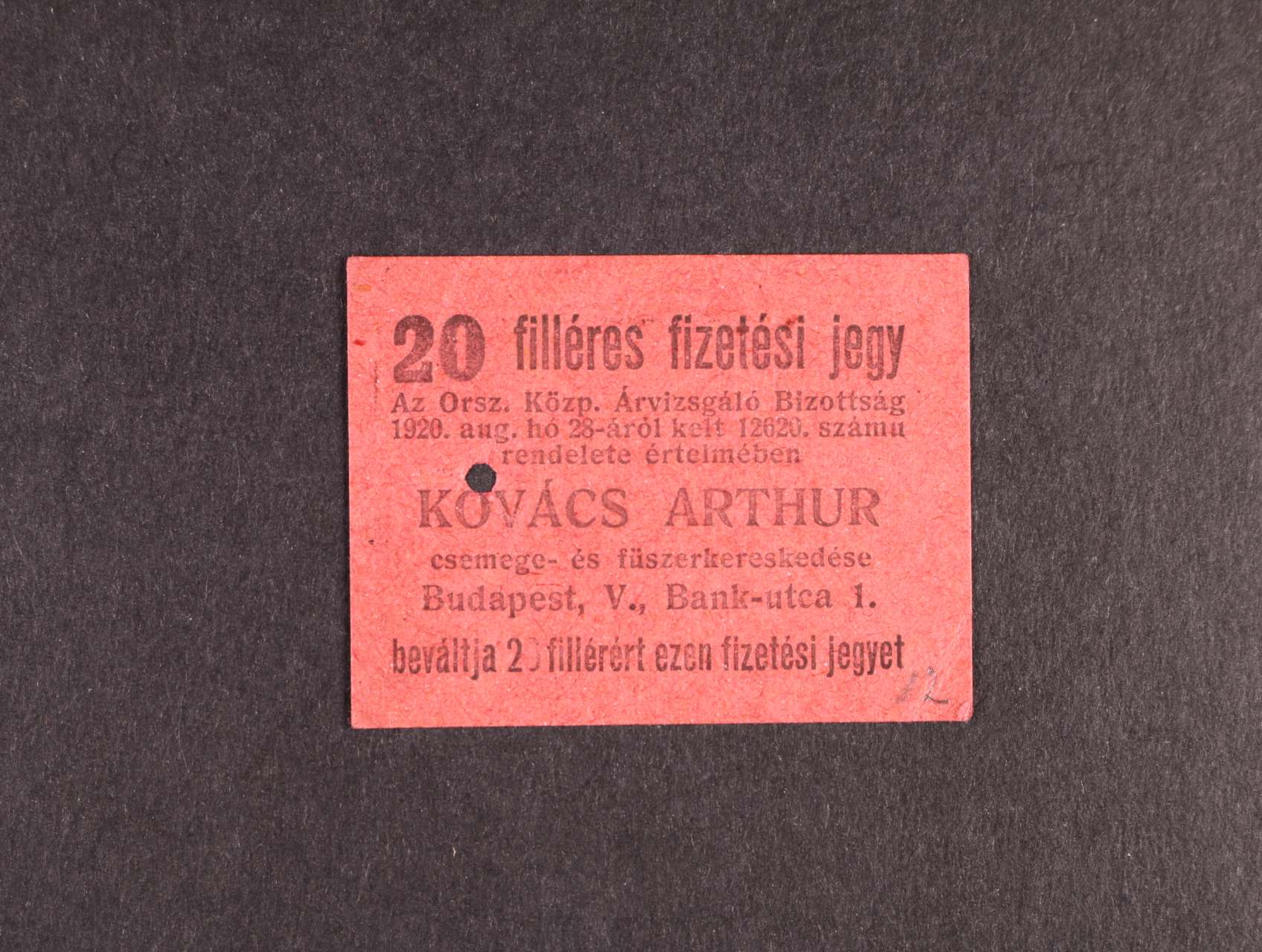Budapest, 20 fil. 1920 Kovács Arthur, OKÁ-49.2, perf. otvor