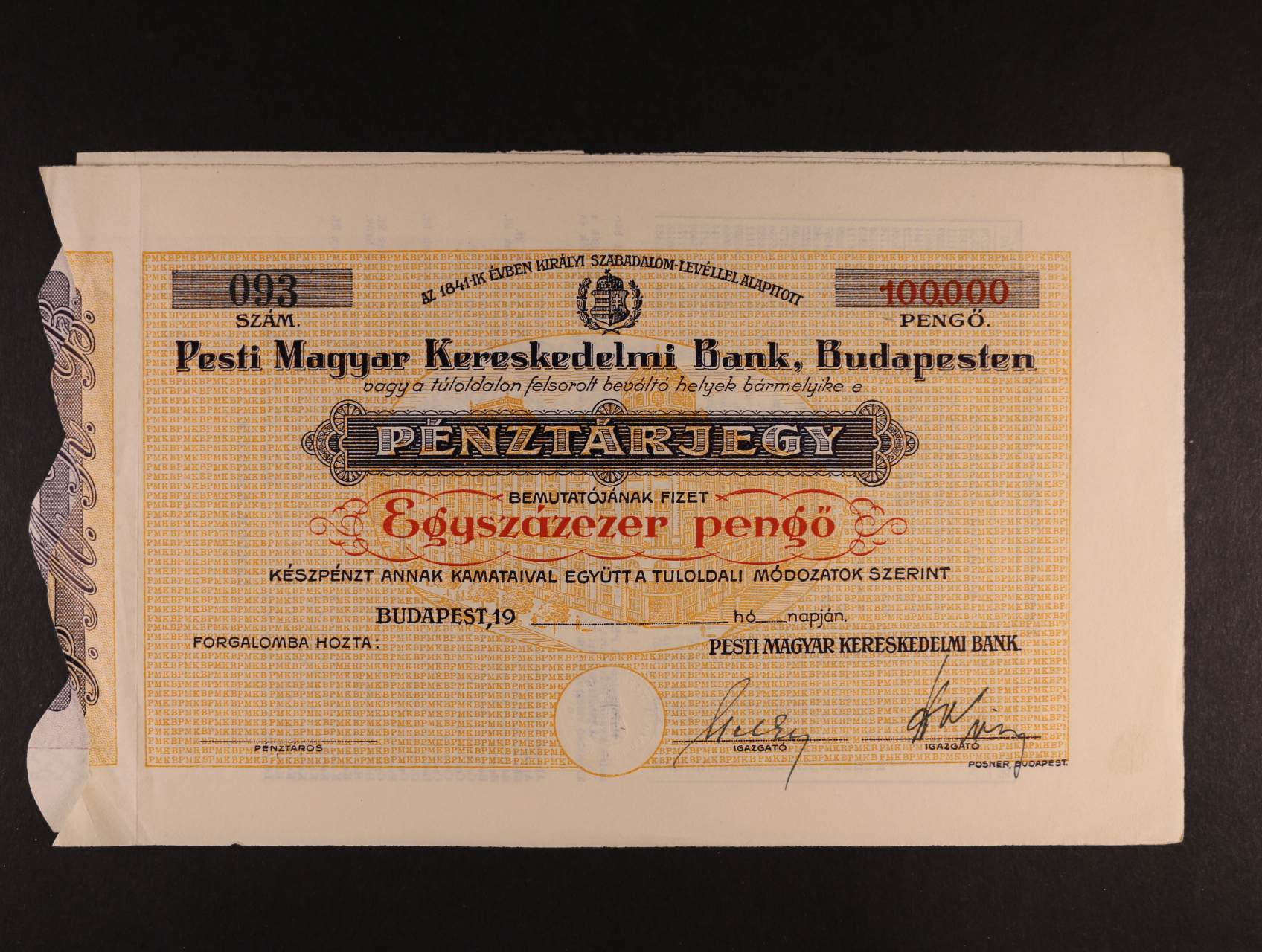 Budapest - pokladniční poukázky, 25.000, 50.000 a 100.000 Pengö 1941 - 1944 Pesti Magyar Kereskedelmi Bank, 1x s kupónem, PKB-1.6, 7, 8