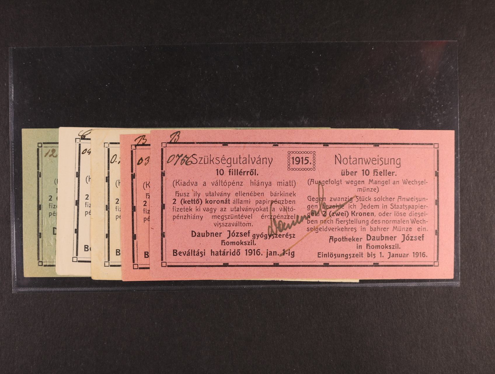 Homokszil, 10, 20 fil 1915 Daubner József gyógyszerész, HOM-1.1, 2, celkem 2ks
