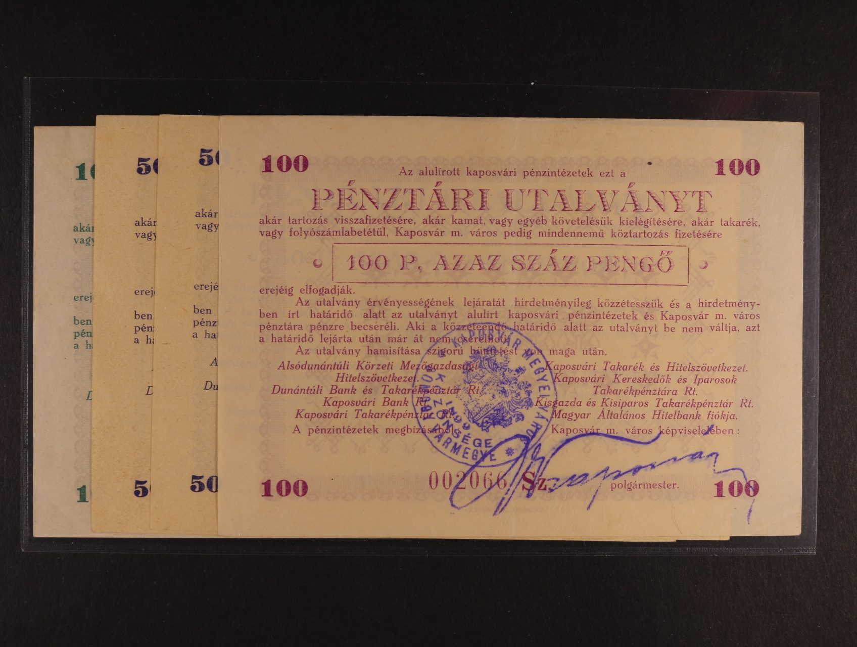 Kaposvár, 10, 2x 50, 100 Pgö 1945 Kaposvári Pénztári Utalvány, 1x perf. otvor, KAP-2.1, 2, 3