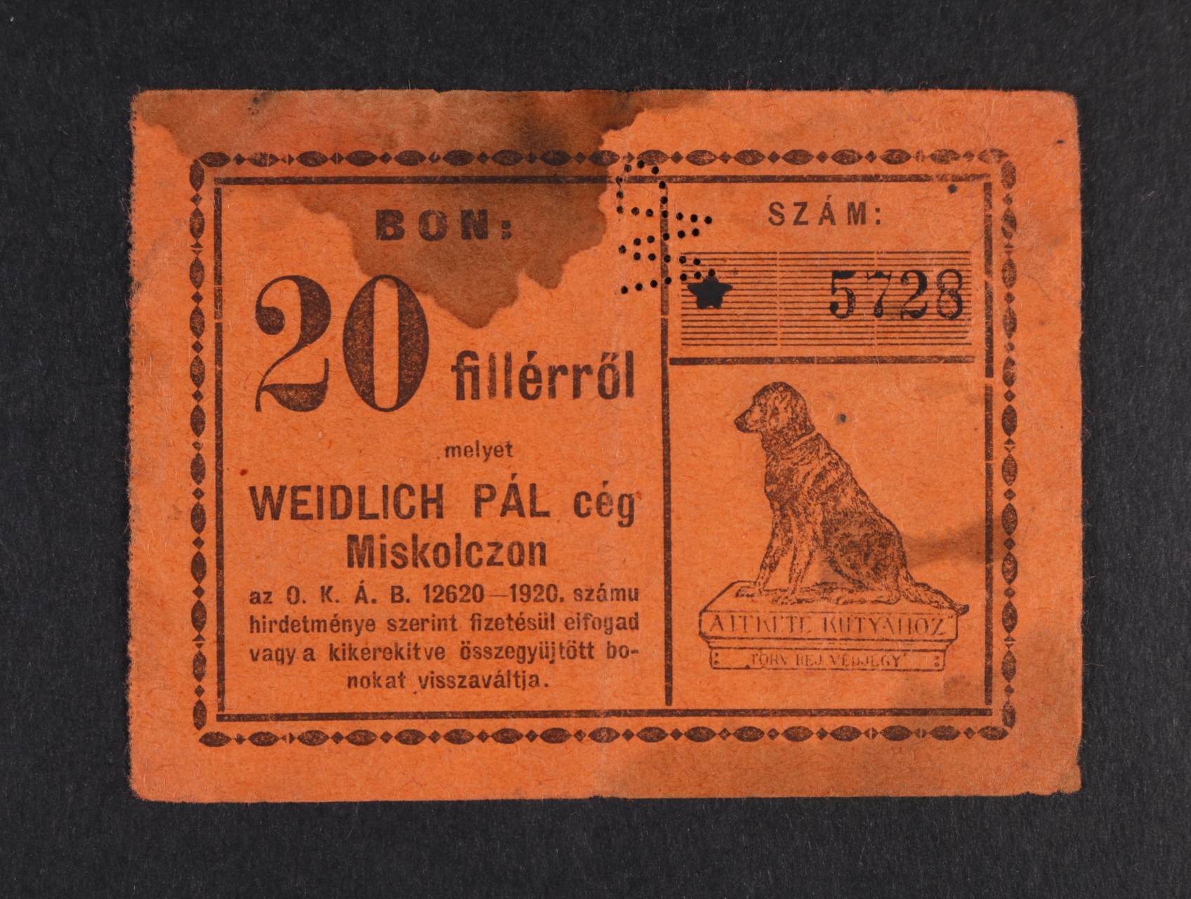 Miskolcz, 20 fil Weidlich Pál, MIS-31.1, perf., skvrna