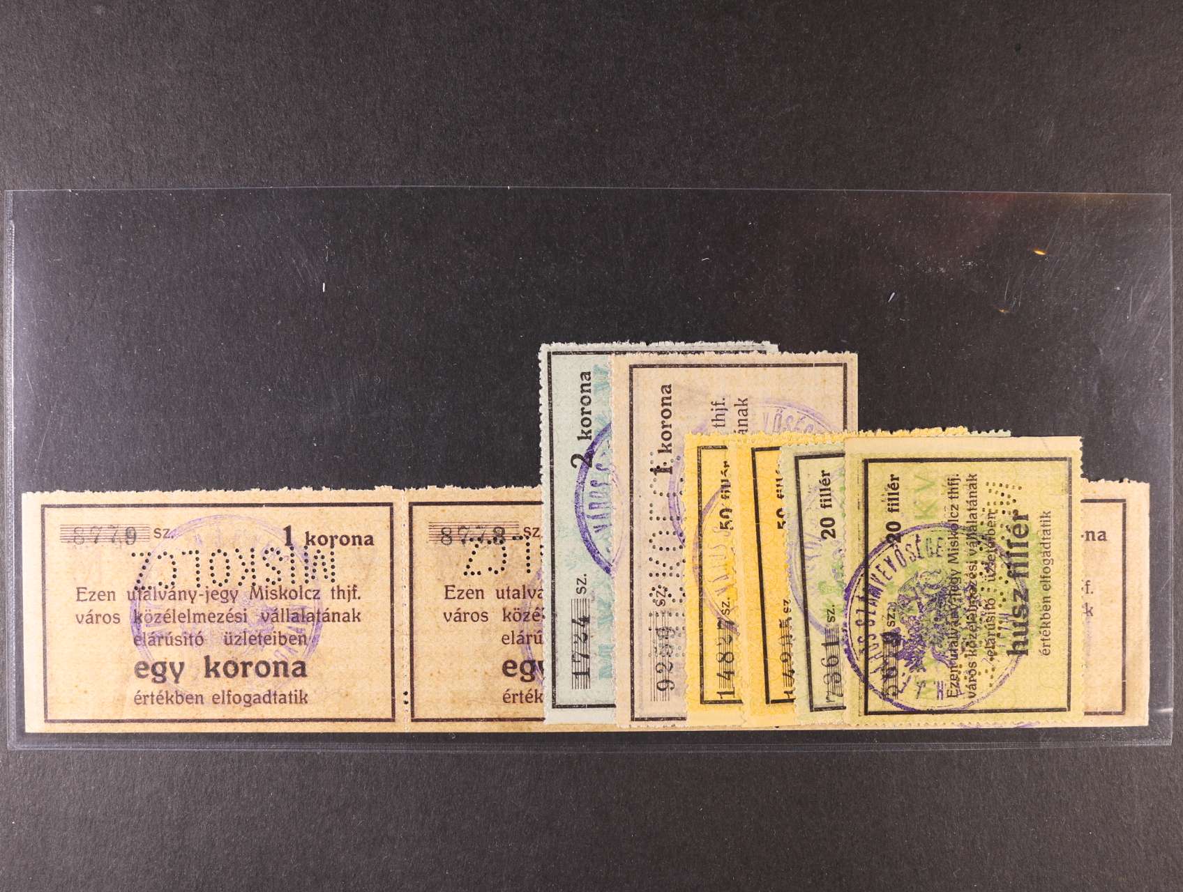 Miskolcz,2x 20, 2x 50 fil, 1 K, 2 K + 3-páska 1 K Miskolcz Thjf. Város, MIS-4.1, 2, 3, 4, celkem 9ks, MIS-31.1, perf., raz.