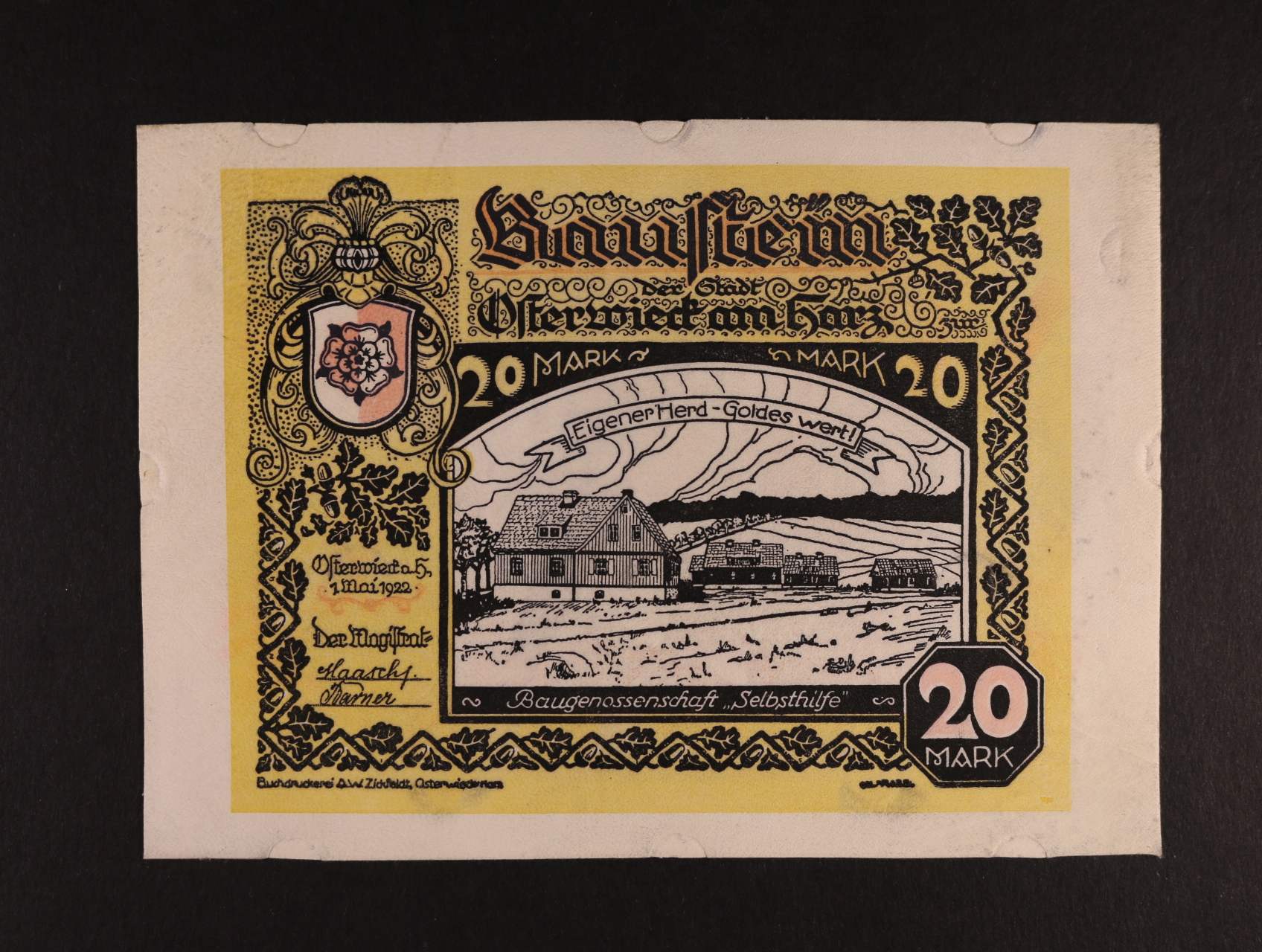 2482 Osterwieck am Harz, 20 Mark 1.5.1922 kůže, Grab. 350.b, stopy po uchycení 200