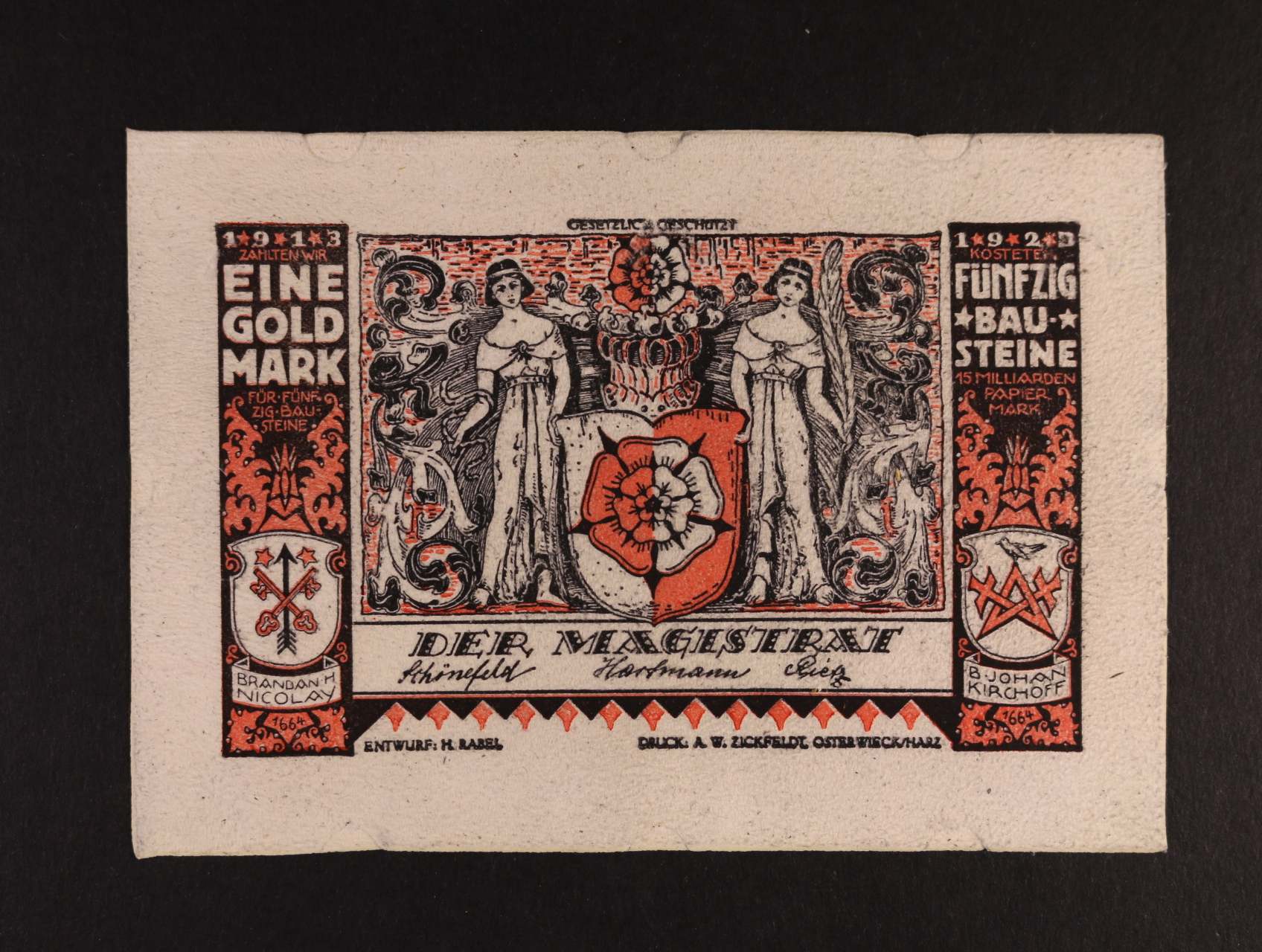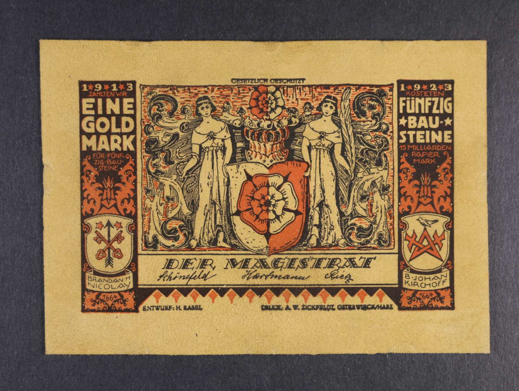 2487 Osterwieck am Harz, 1 Goldmark b.d.(1923) bílá kůže, Grab. 364, stopy po uchycení 300