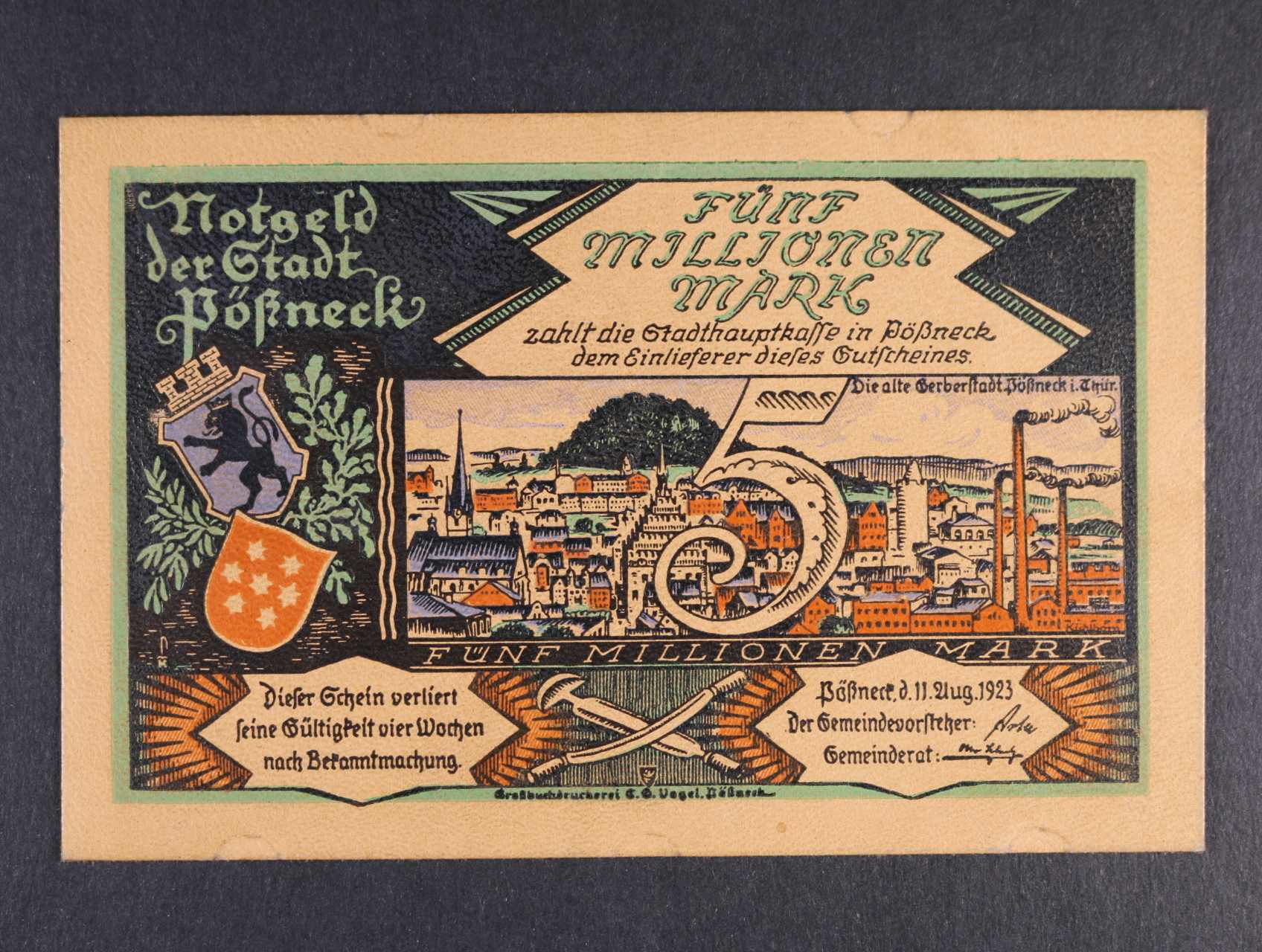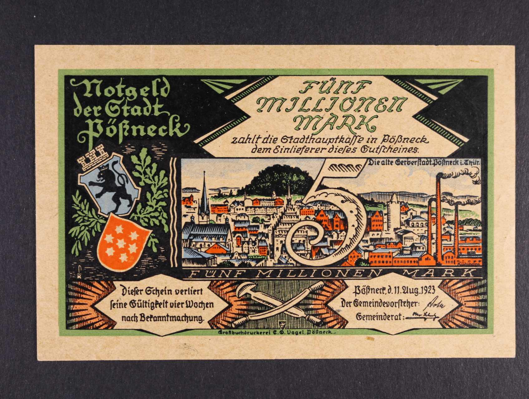 2489 Pössneck, 5 Millionen Mark 11.8.1923 kůže, Grab. 450, stopy po uchycení 200