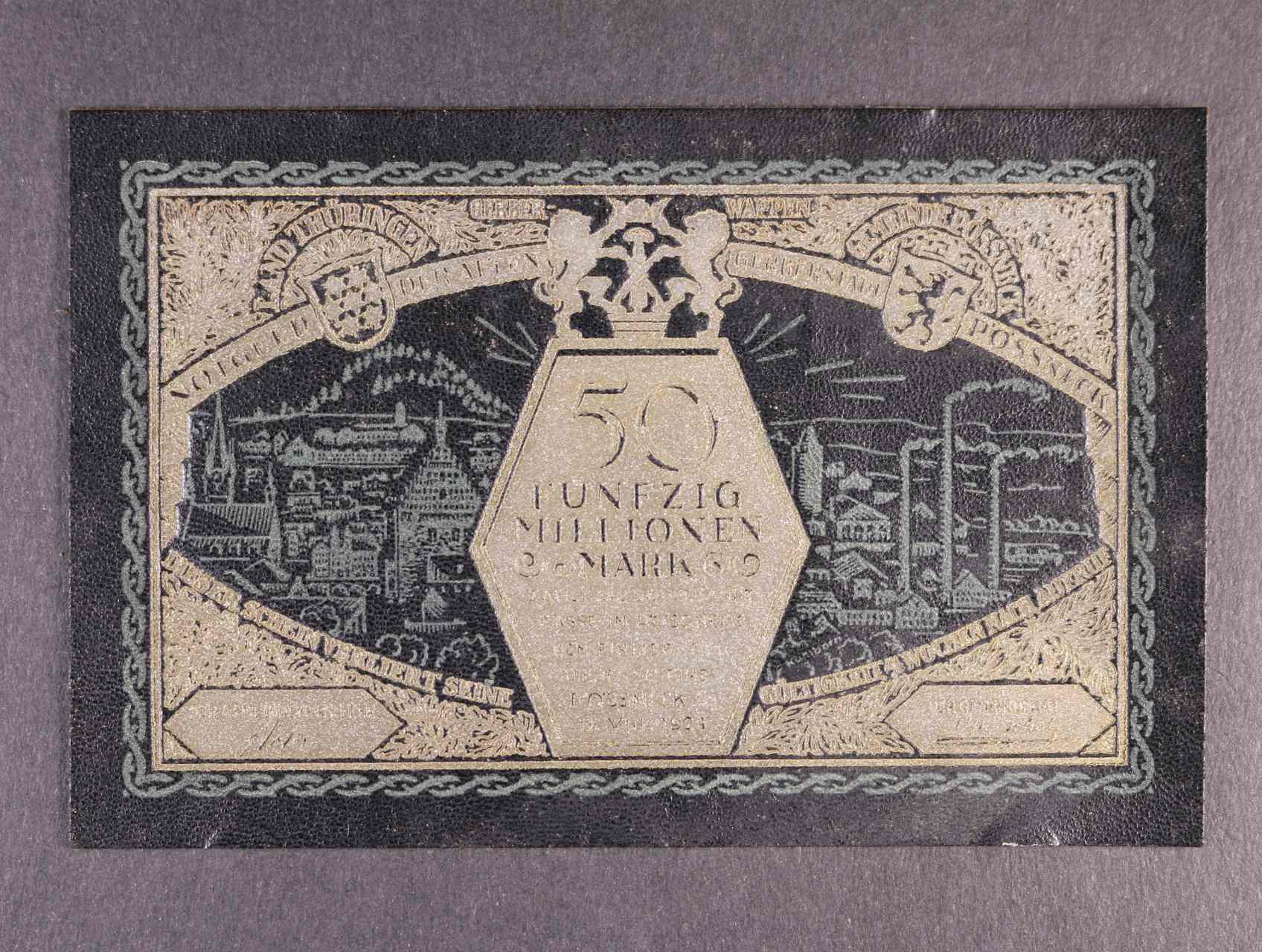2493 Pössneck, 50 Millionen Mark 11.8.1923 černá kůže, Grab. 454, stopy po uchycení 600