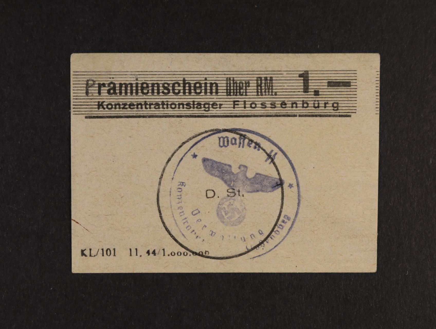 2499 Flössenbürg, 1 RM b.d. (1944), tisk na zeleném kartonu, raz. Waffen SS, Pi.-Si. 87b 1500