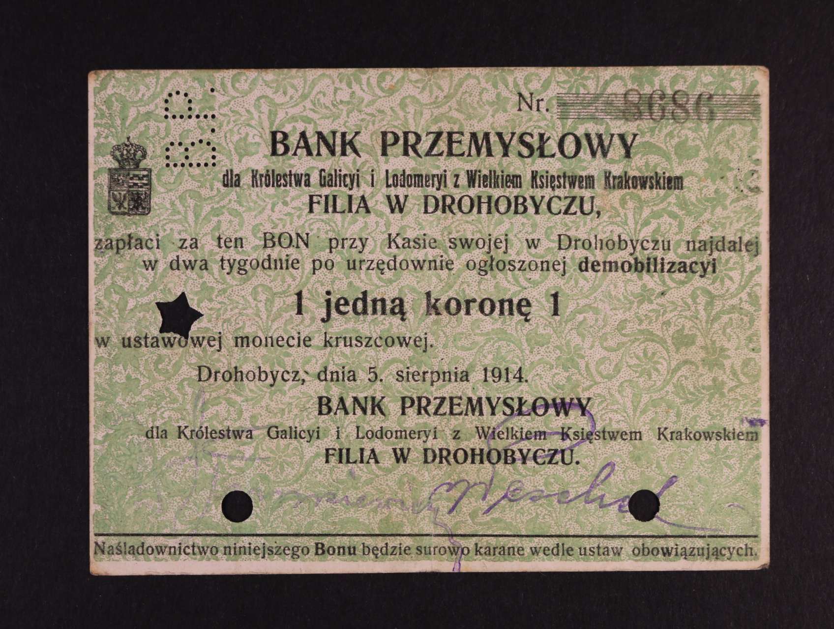 2519 Drohobycz, 1 K 5.8.1914 Bank przemyslowy, perf., Pod. G-082.1h 300