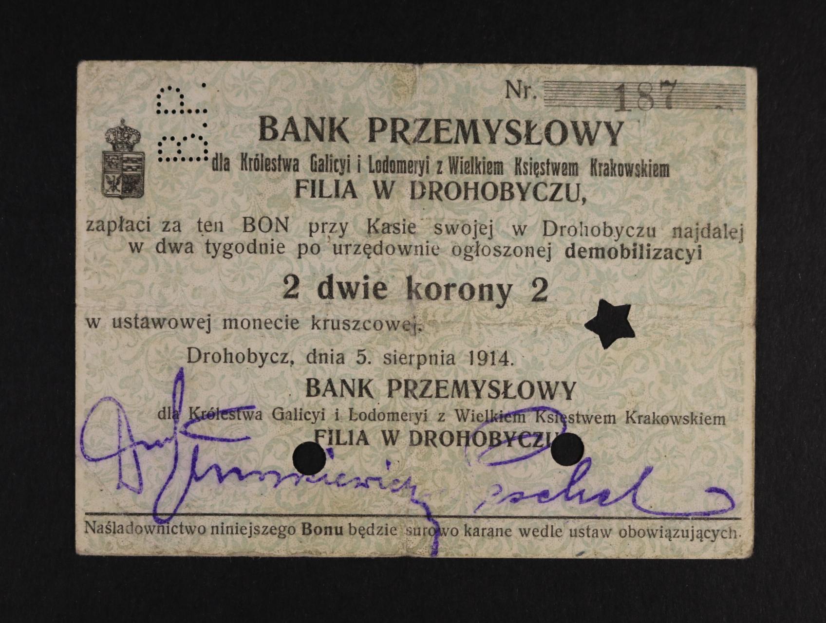2520 Drohobycz, 2 K 5.8.1914 Bank przemyslowy, perf., Pod. G-082.2b 400