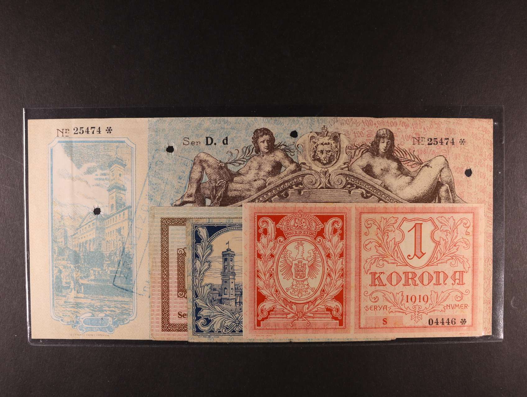 Lwów, 1 K 11.9.1914, 50 h, 1 K 5.6.1919, 100 K 30.10.1915 (7x perf. otvor) Gmina Miasta, Pod. G-203.A.1.o, B.1, 2, C.1