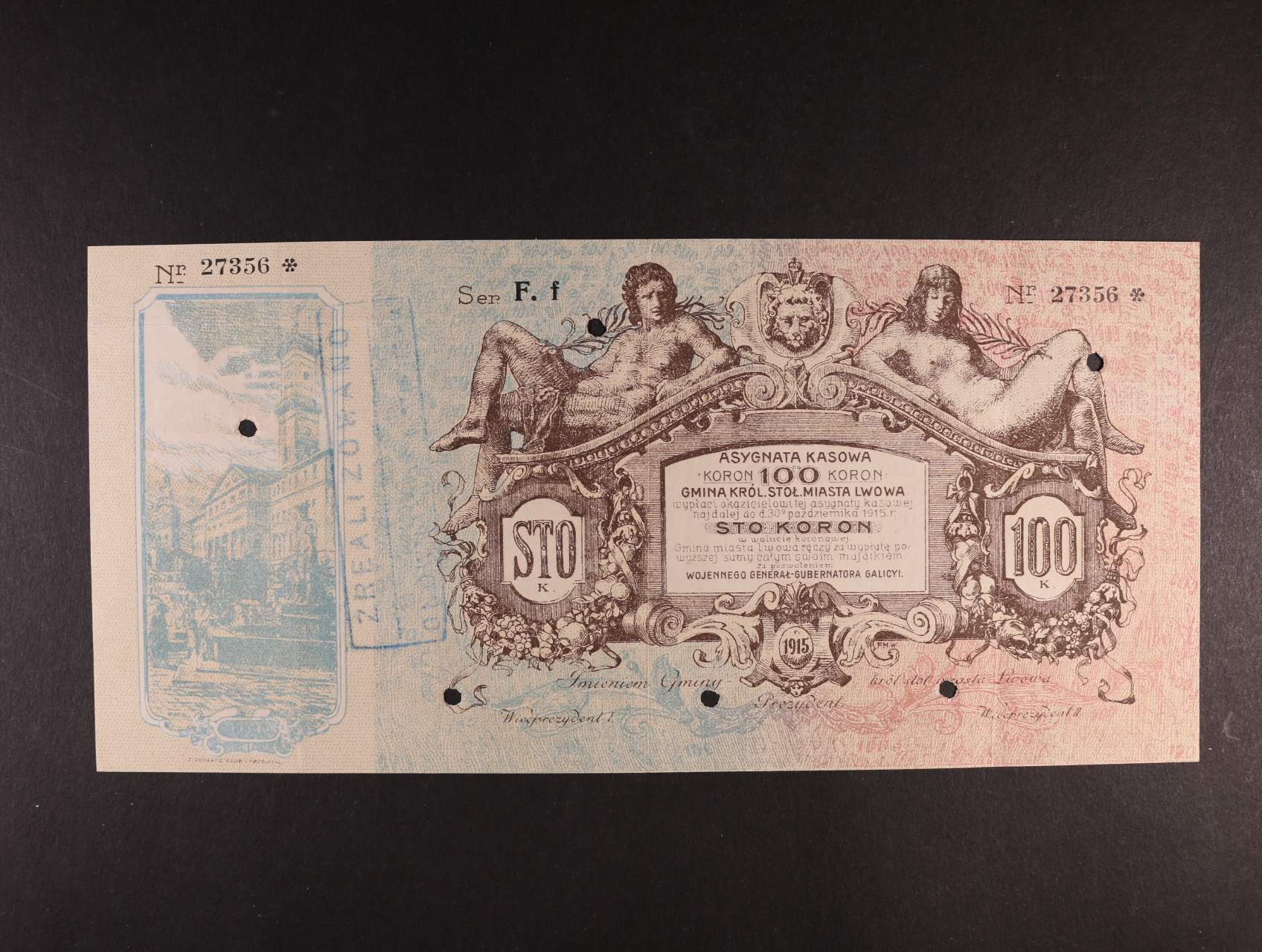 Lwów, 100 K 30.10.1915 série F.f (7x perf. otvor) Gmina Miasta, Pod. G-203.C.1