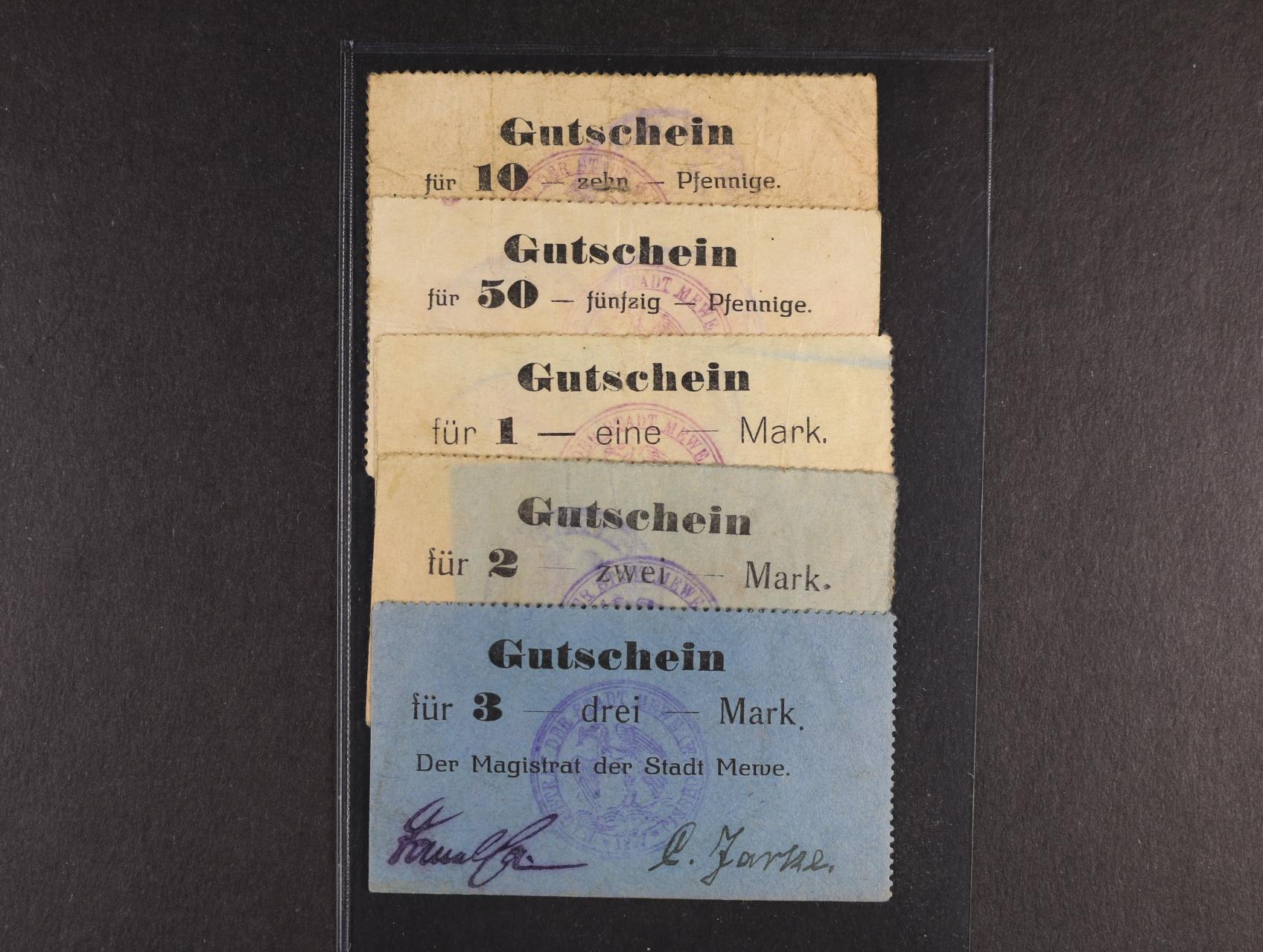 Mewe (Gniew), 10 Pf., 50 Pf., 1 M, 2 M, 3 M b.d. (1914) Magistrat, Pod. W-013.A.1, 2, 3, 4, 5