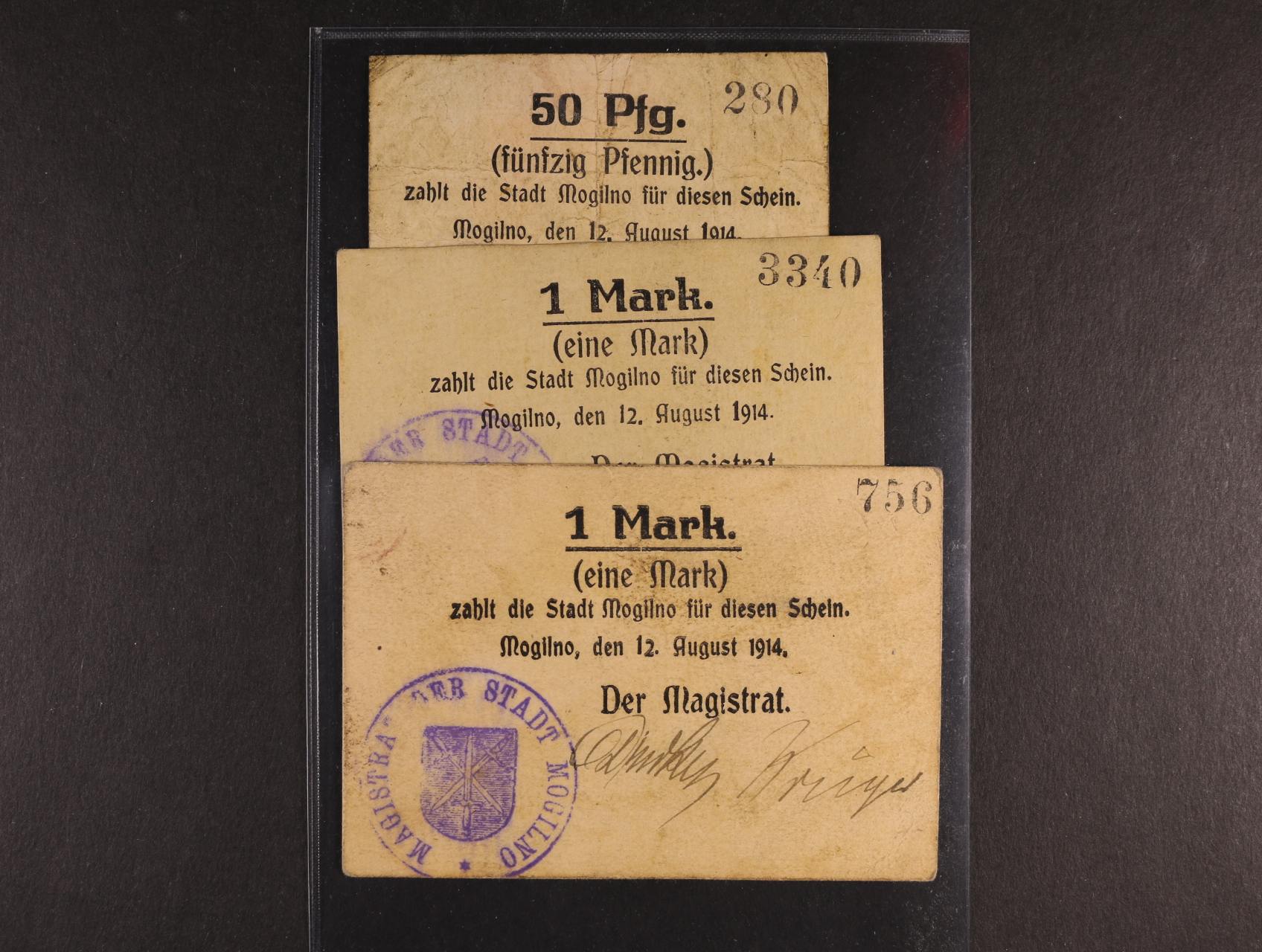 Mogilno, 50 Pf., 1 M (2x) 12.8.1914 Der Magistrat, u 1 M varianty velká a malá "1", Pod. P-103.1.C, 2
