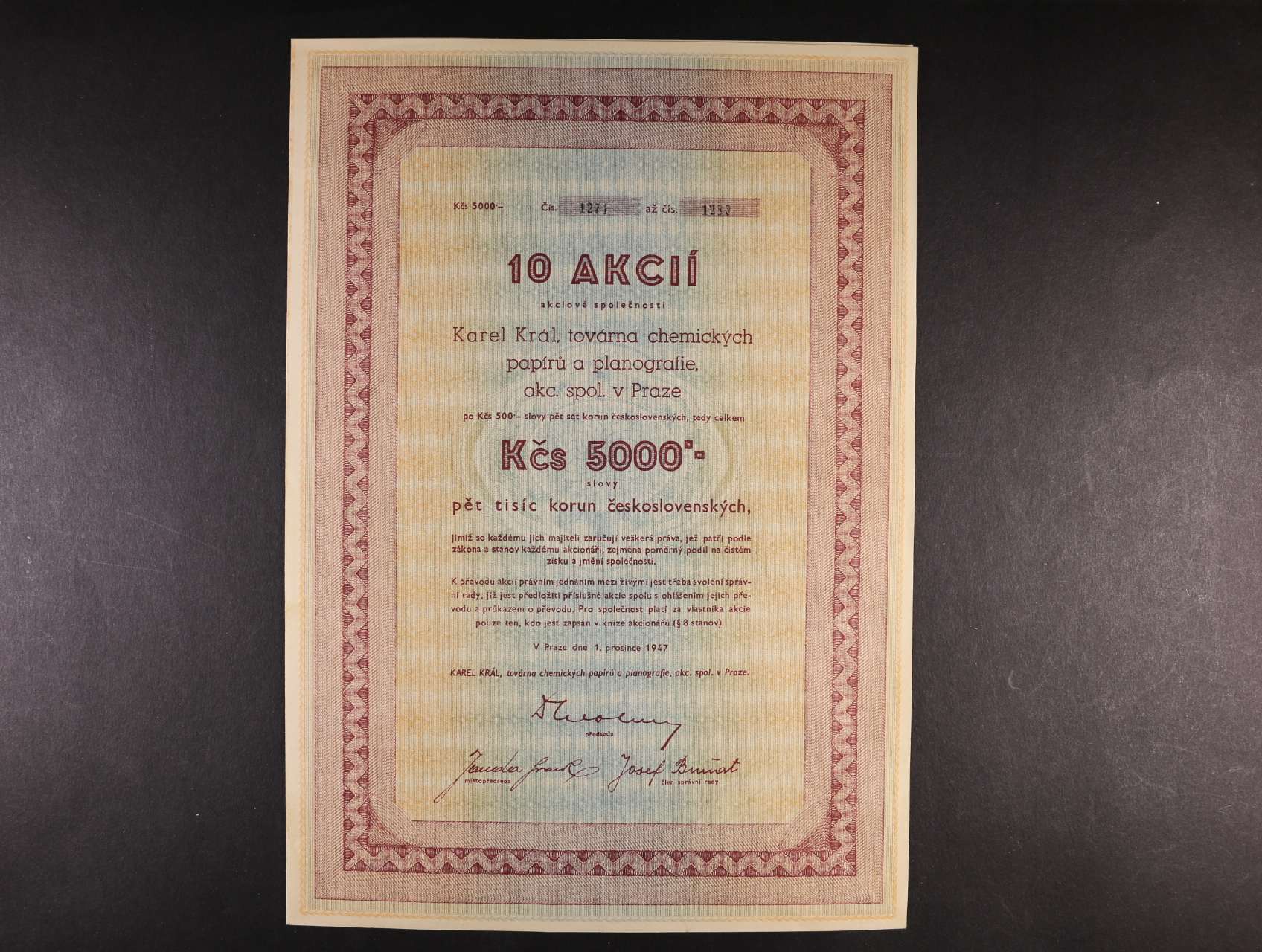 10 Akcií po 500 Kčs - 5000 Kčs Karel Král, továrna chemických papírů a planografie v Praze, 1947, včetně kupónů