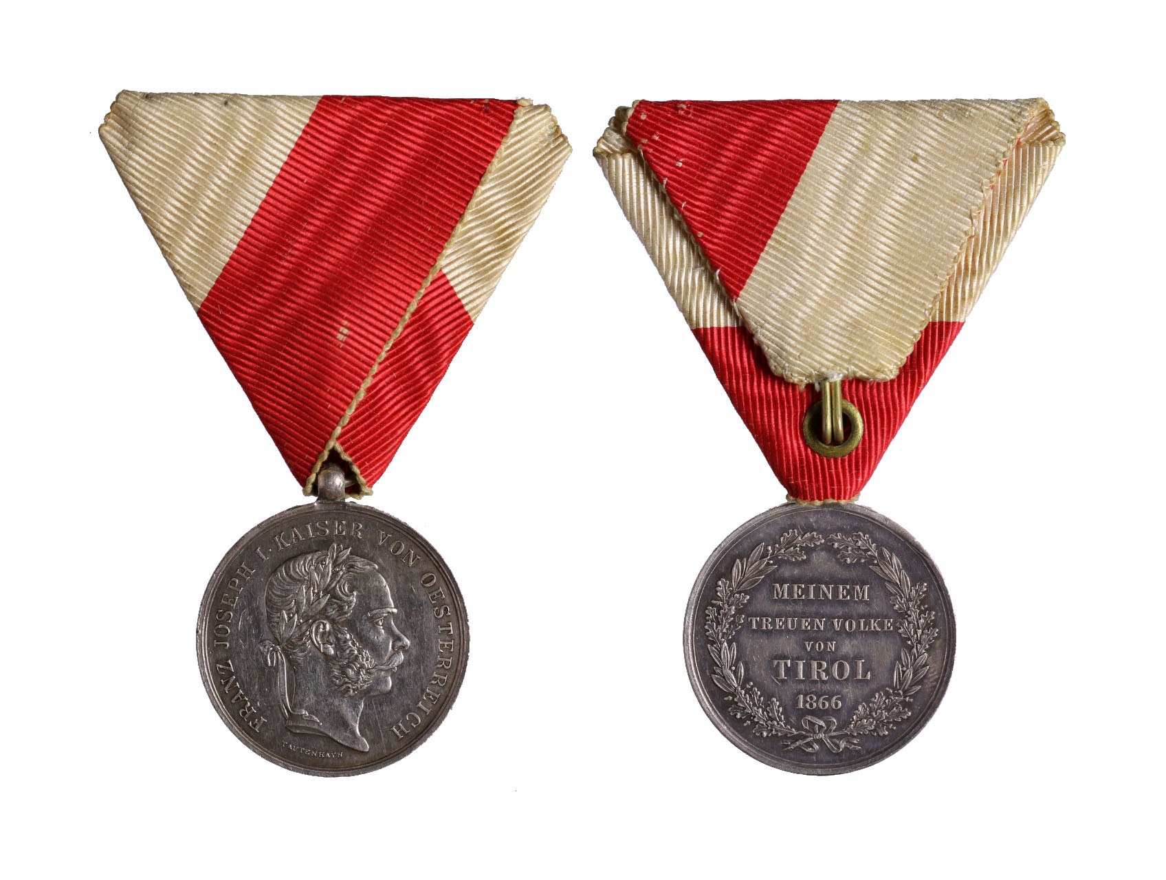 2705 Stříbrná pamětní medaile pro tyrolské zemské obránce z roku 1866, původní stuha, Ma363 2500
