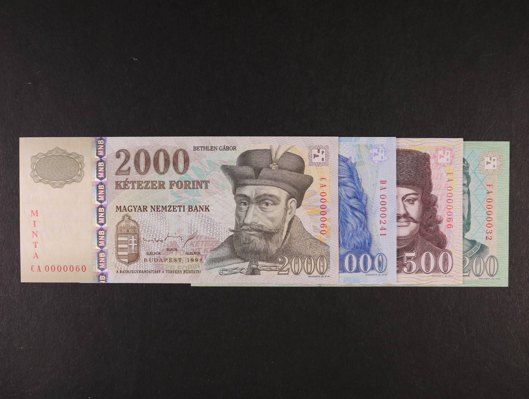 2292 200 Forint 1998 série FA (000032), 500 Forint 1998 (0000066), 1000 Forint 1998 (0000241), 2000 Forint 1998 (0000060), vše s přetiskem MINTA, Pi. 178s, 179s, 180s, 181s, celkem 4ks 3000