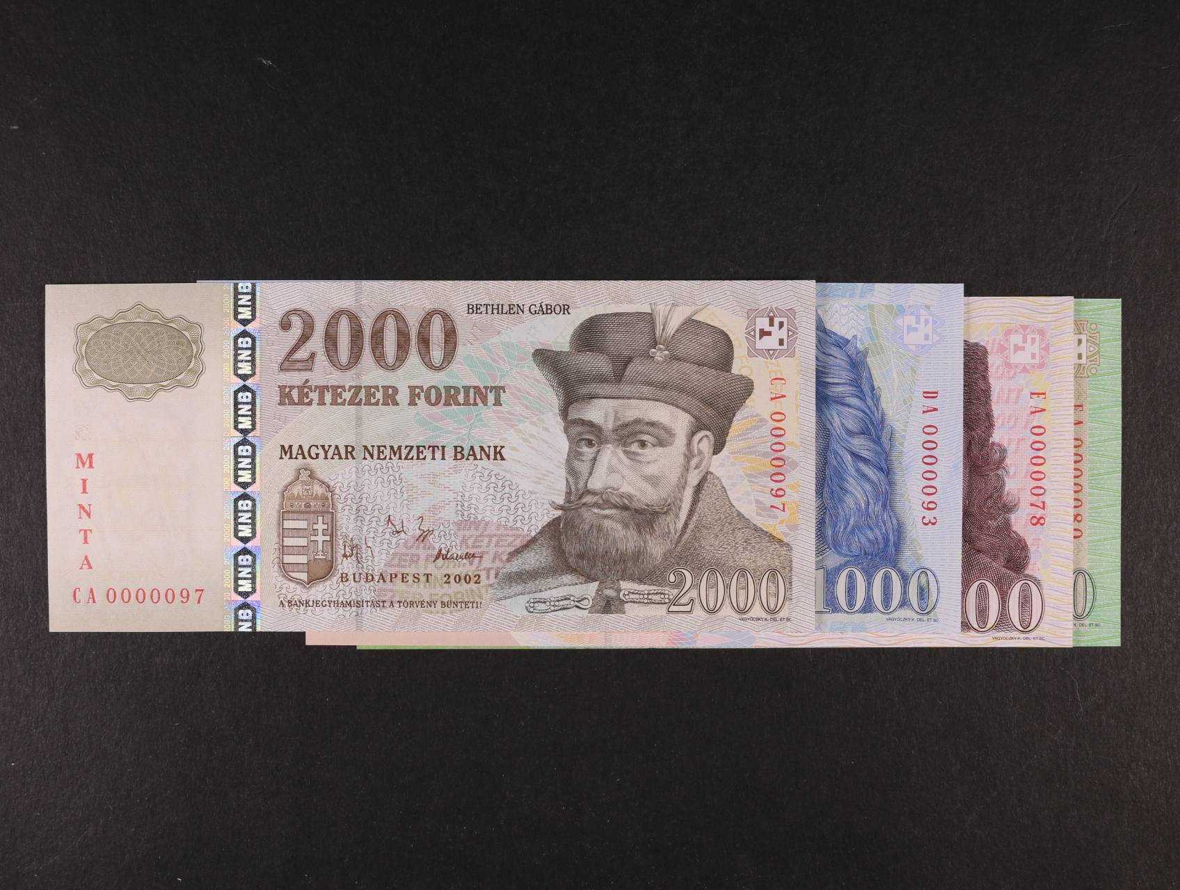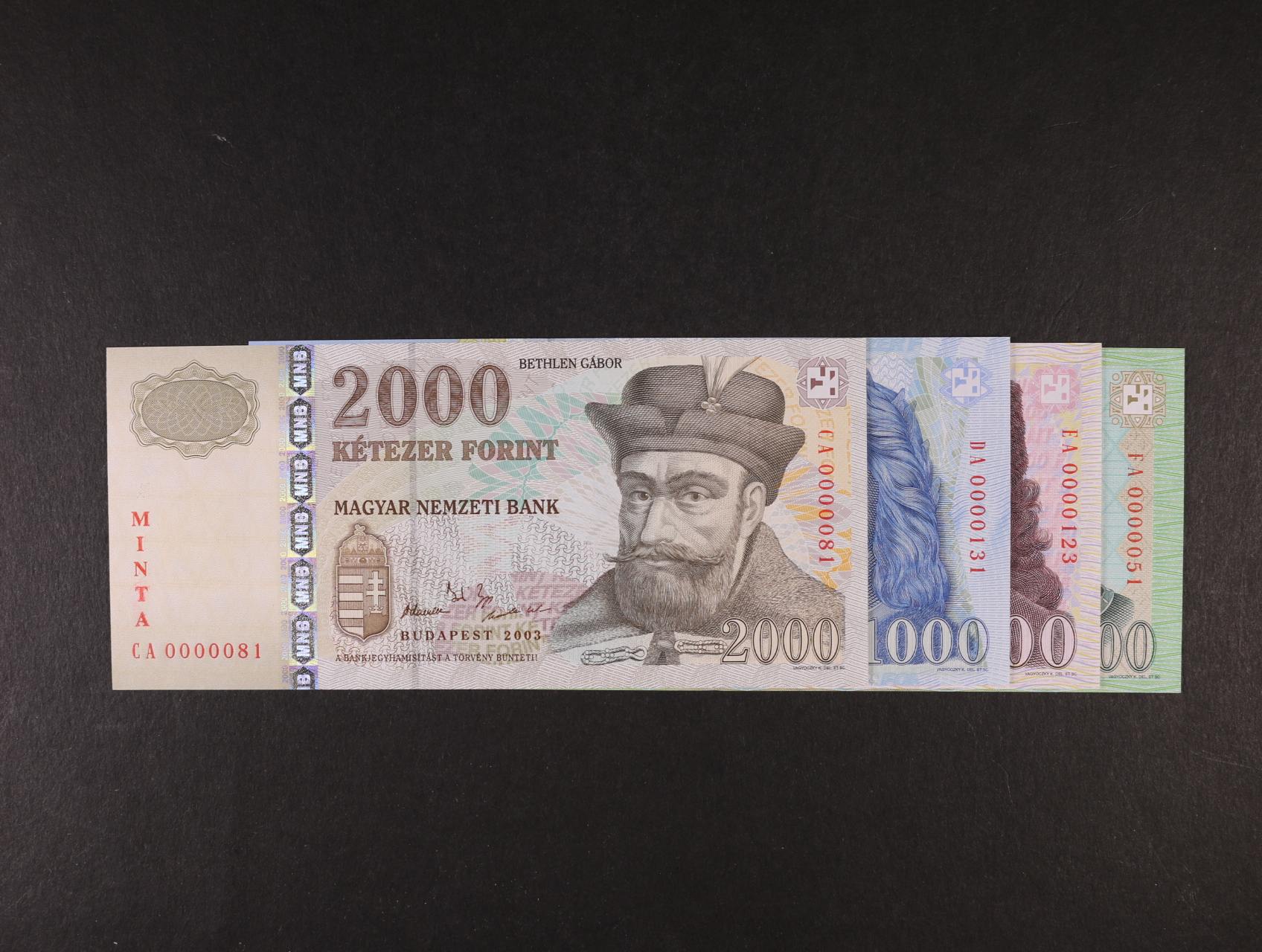2299 200 Forint (0000080), 500 (0000078), 1000 (0000093), 2000 (0000097) Forint 2002 s přetiskem MINTA, Pi. 187s, 188s, 189s, 190s 3000