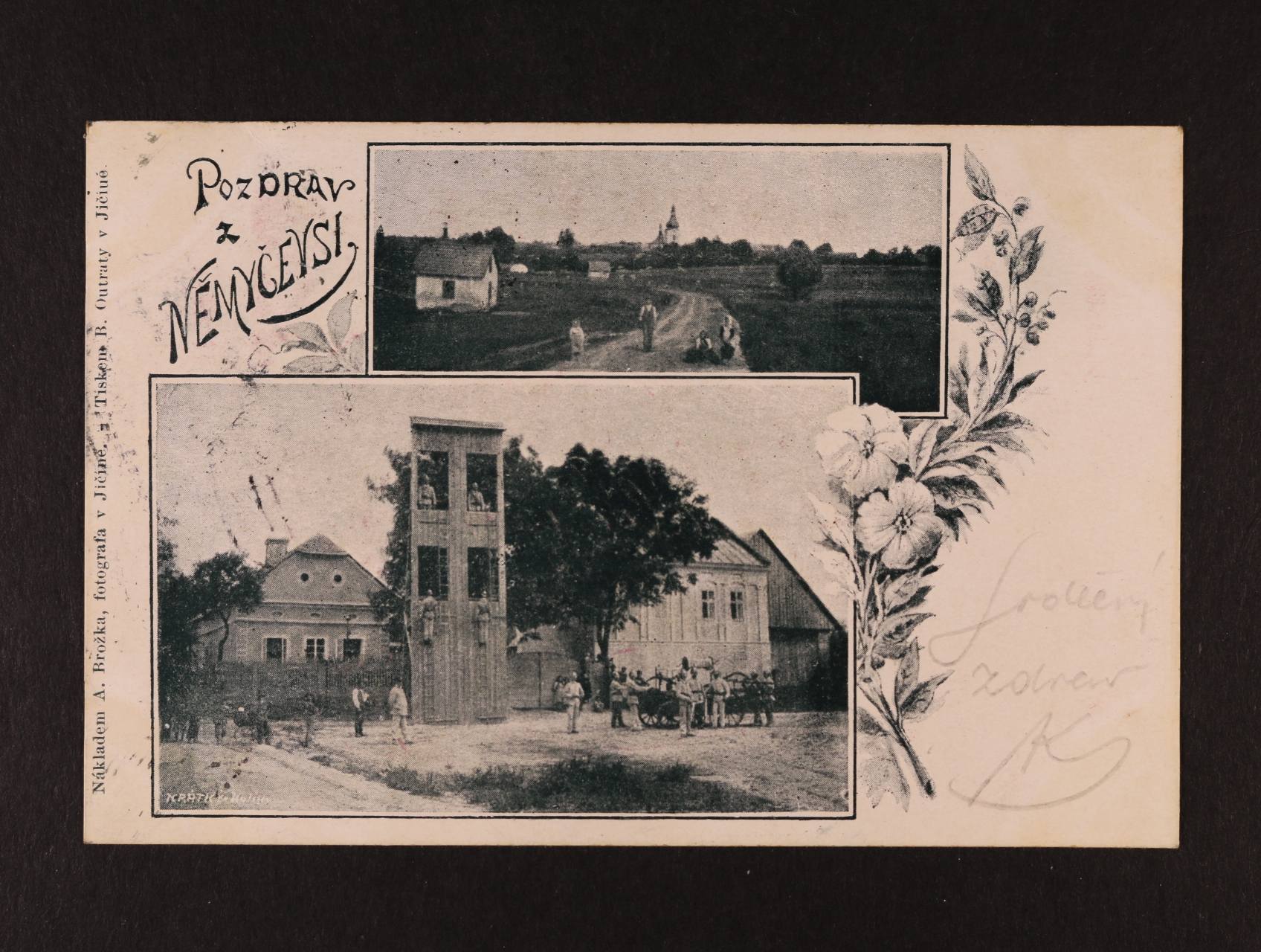 Nemyčeves, okr. Jičín - jednobar. dvouokénková pohlednice, použitá 1901, cvičení hasičů