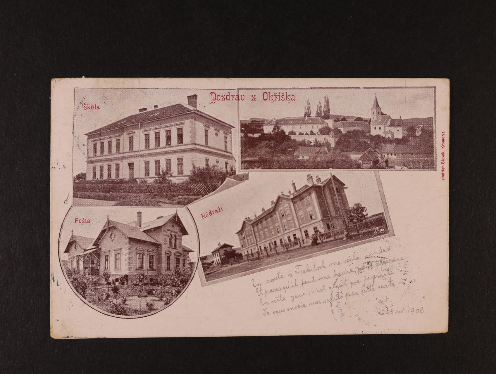 Okříško, okr. Třebíč - dvoubarevná čtyřokénková pohlednice, použitá 1906