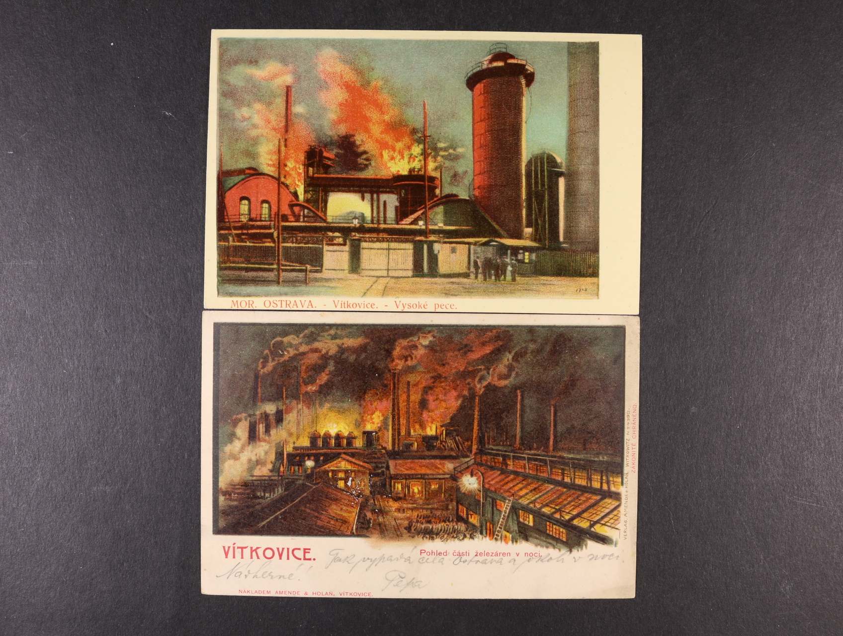 Ostrava-Vítkovice - 2 ks. bar. litografických pohlednic, použité 1907 a 1909, železárny, vysoké pece