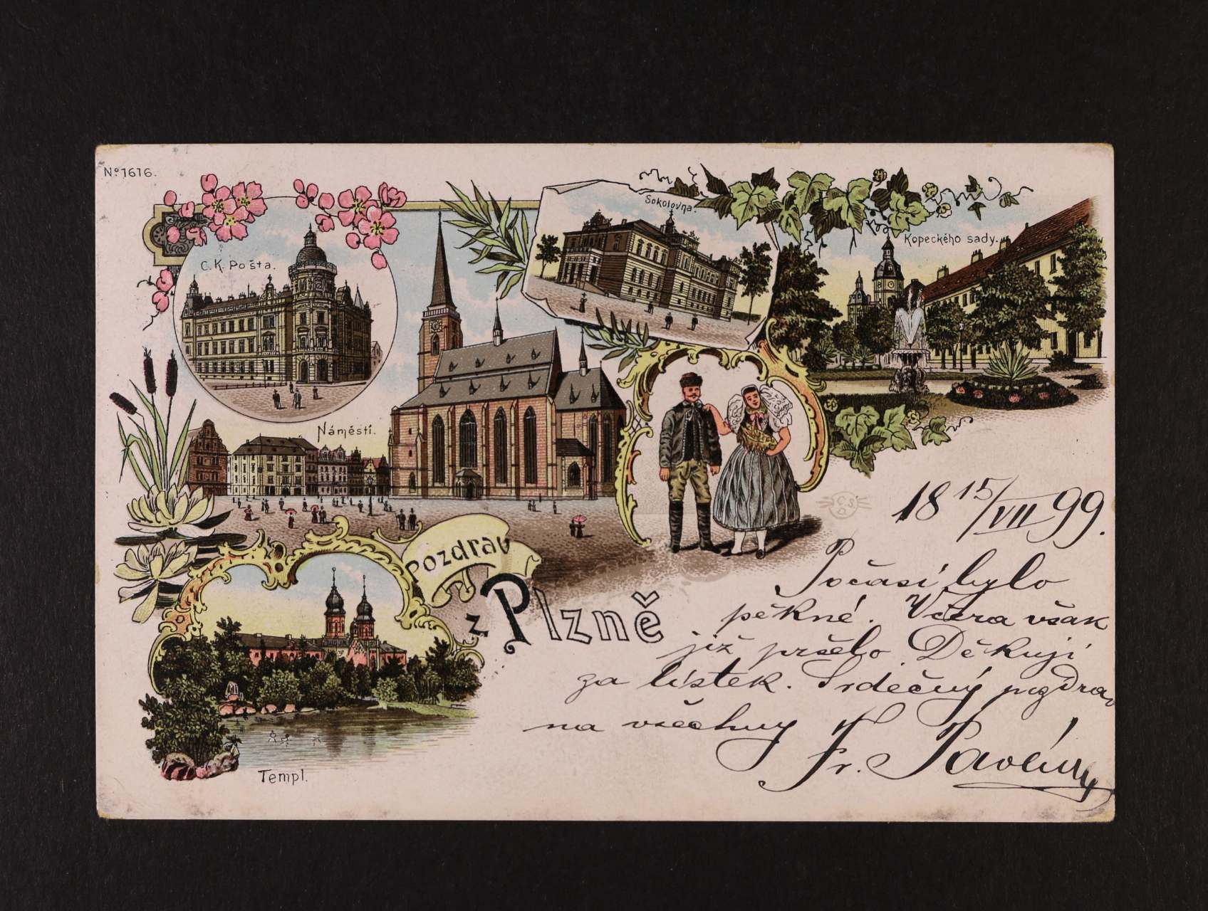 Plzeň - barevná litografická pohlednice, použitá 1905