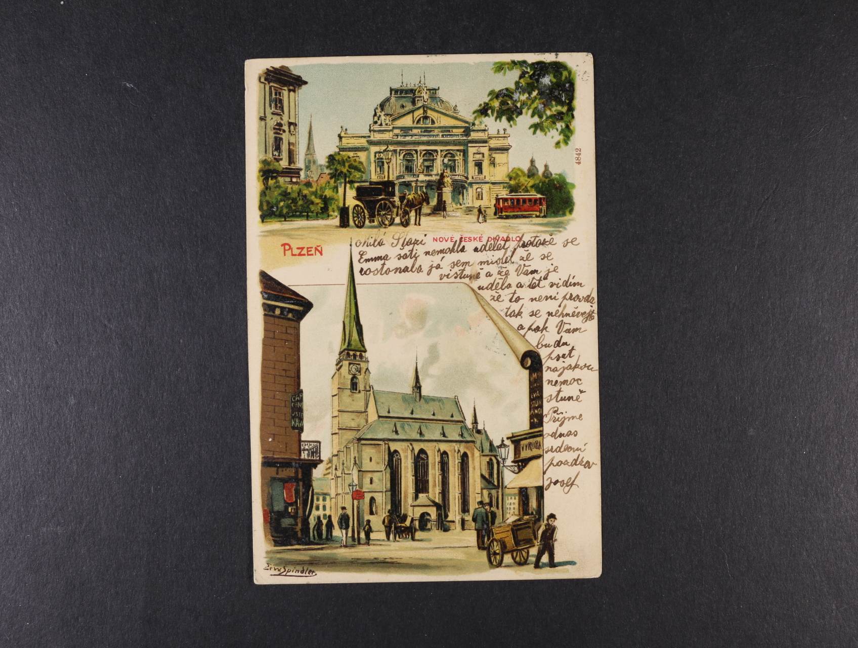 Plzeň - bar. litograf. koláž, dl. adresa, použitá 1899