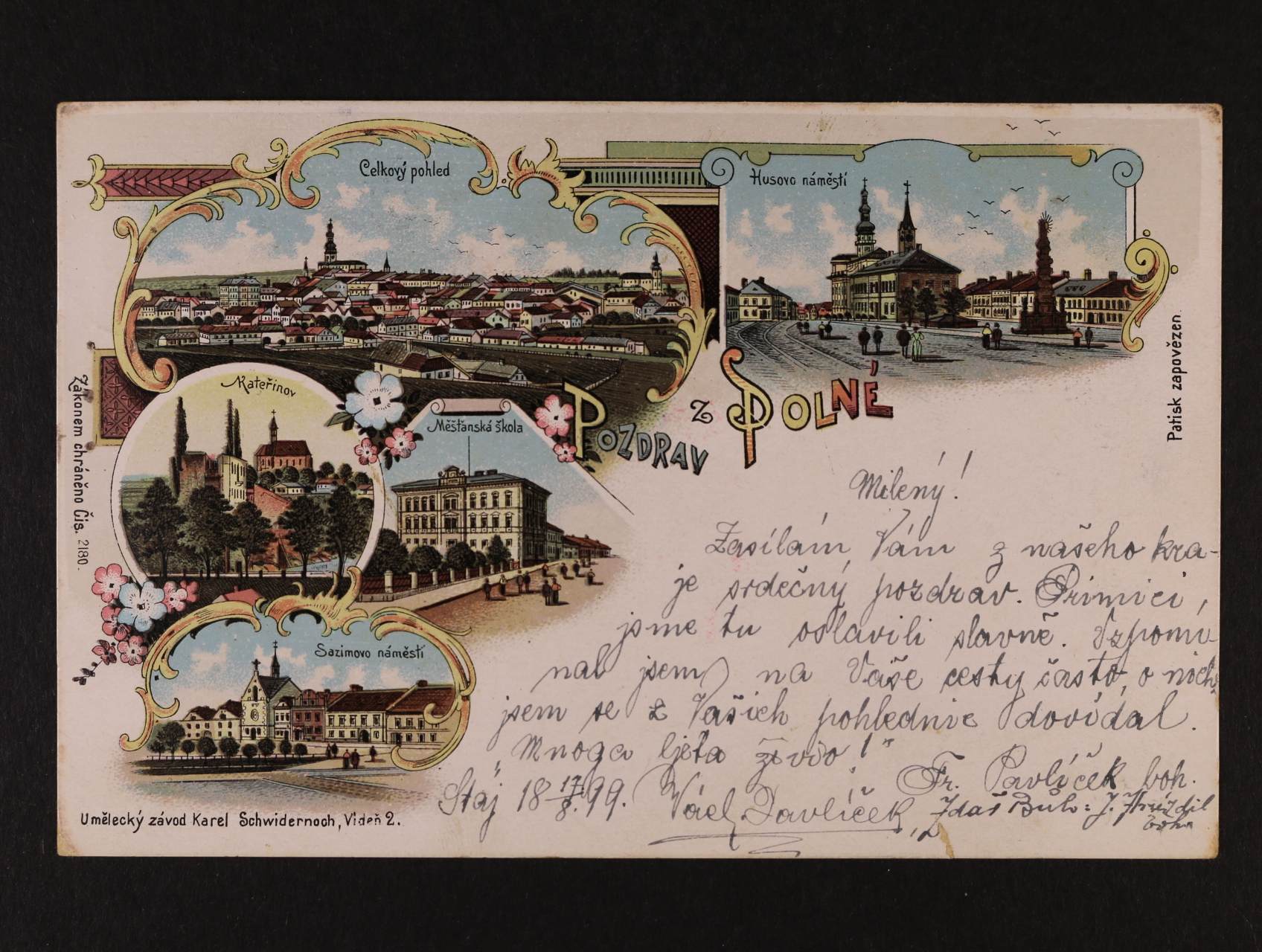 Polná - bar. litograf. koláž, dl. adresa, použitá 1899