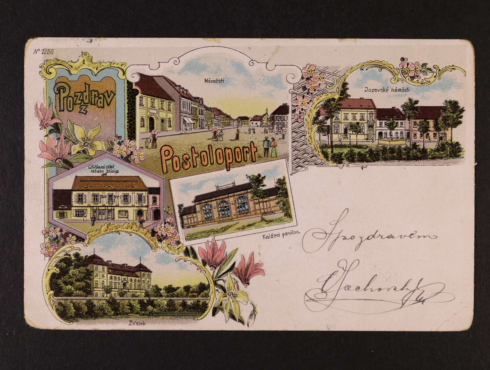 Postoloprty - bar. litograf. koláž, dl. adresa, použitá