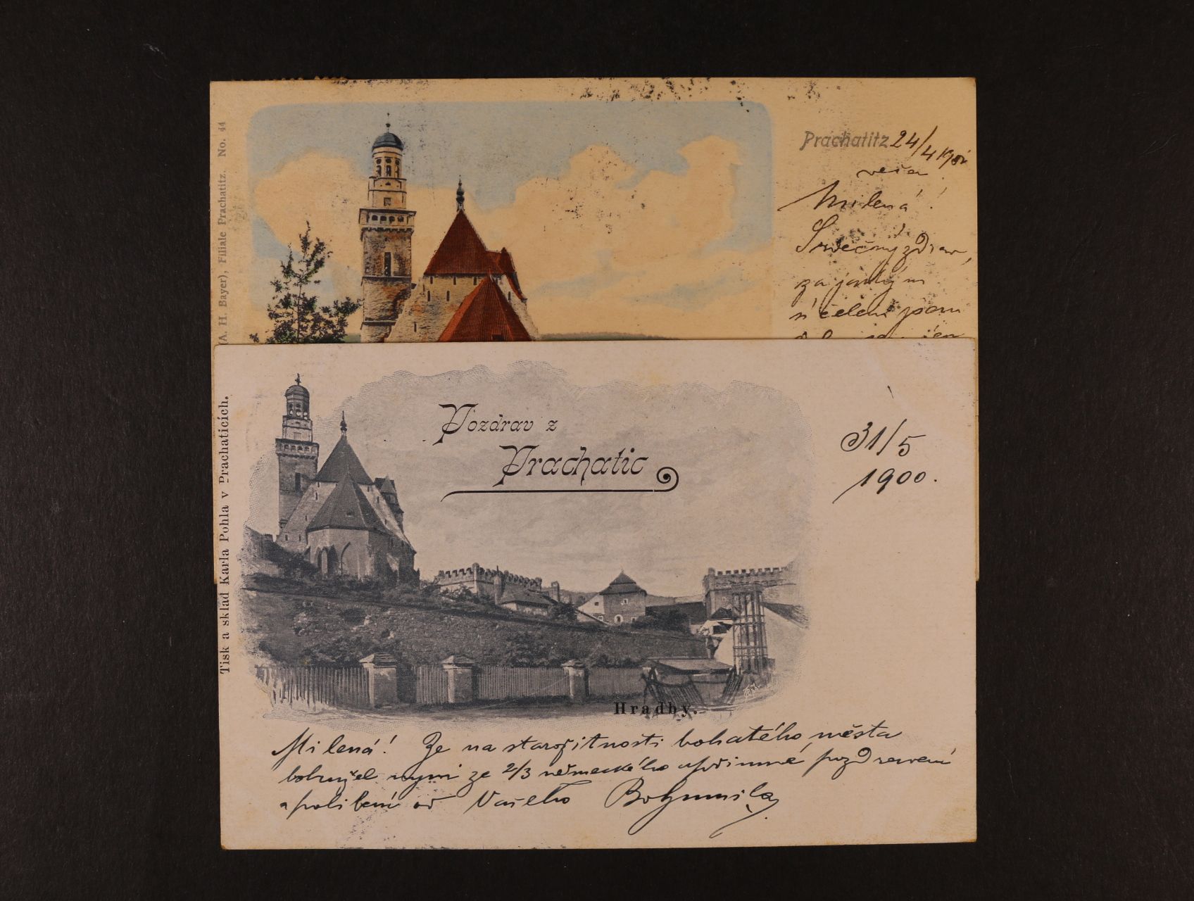 Prachatice - 2 ks. pohlednic, použité 1900 a 1901