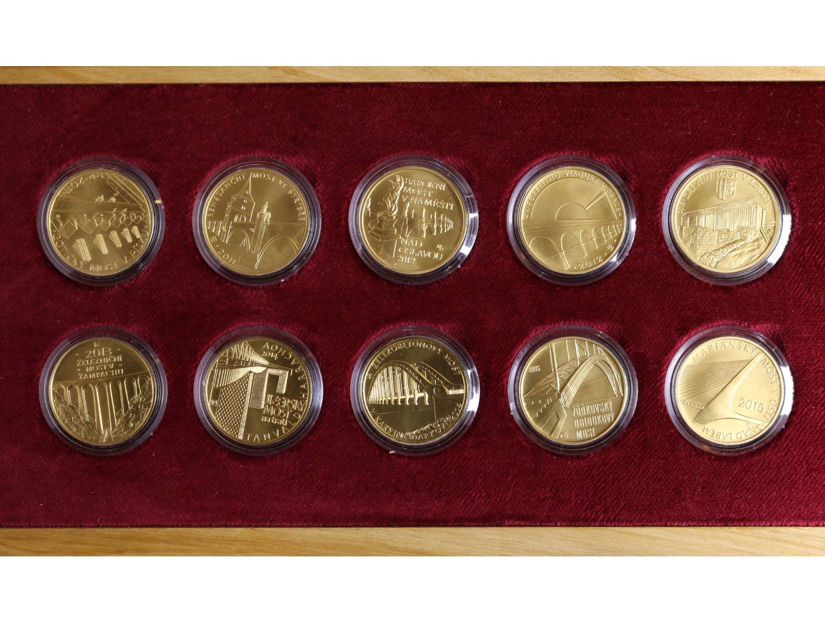 Česká Republika 1993 - kompletní sada zlatých mincí 5000 Kč 2011 - 2015 Mosty České republiky, 10ks mincí ve společné dřevěné etui, Au 999,9, 10x 15,55g, kvalita b.k., certifikáty, bezvadná kvalita
