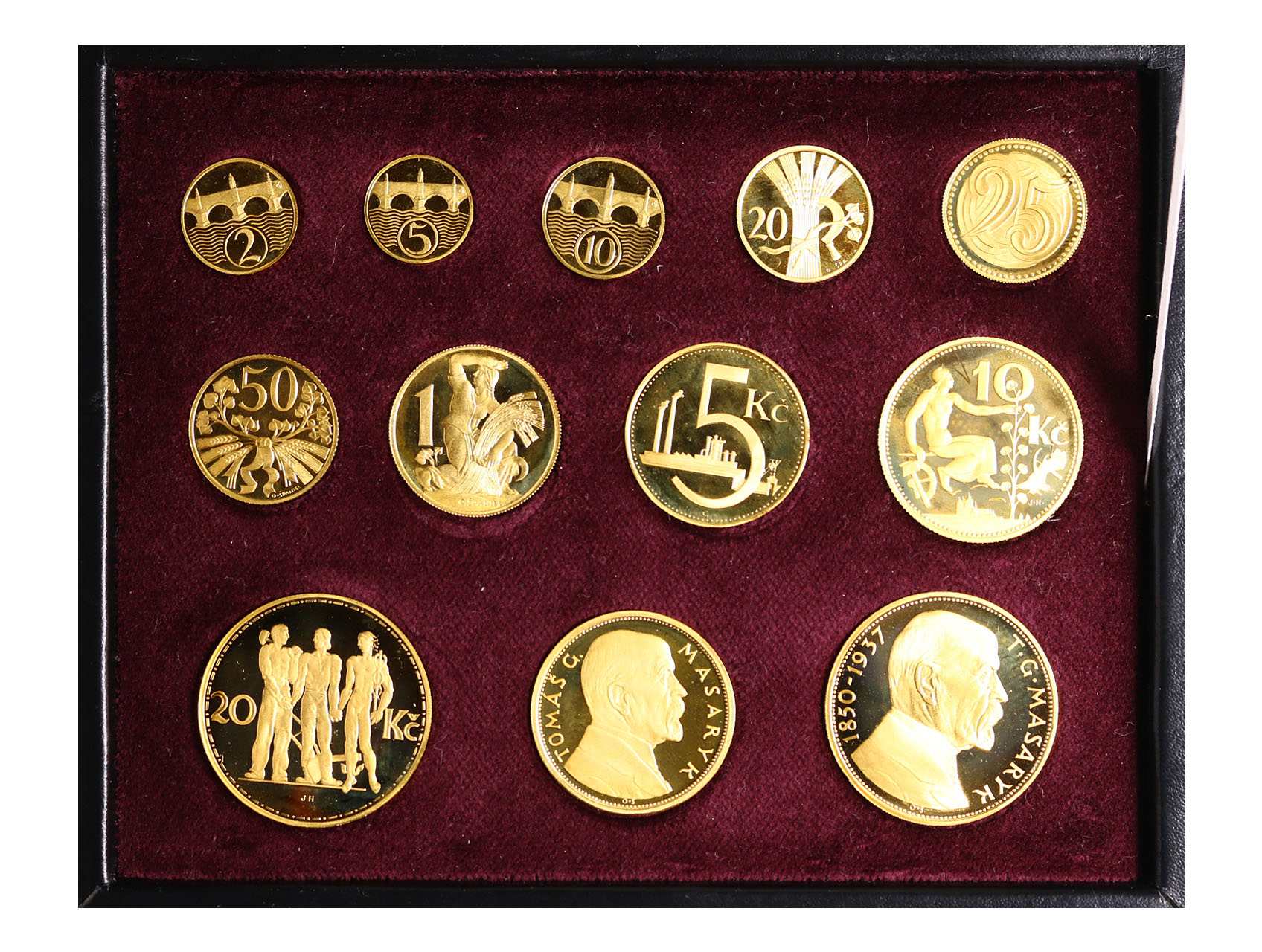 Česká Republika 1993 - sada 12 ks medailí "zlaté repliky oběhových mincí ČSR I. 1918 - 1939", Au 986, celkem 101,9 g, náklad 40 ks, etue, kvalita proof, certifikát