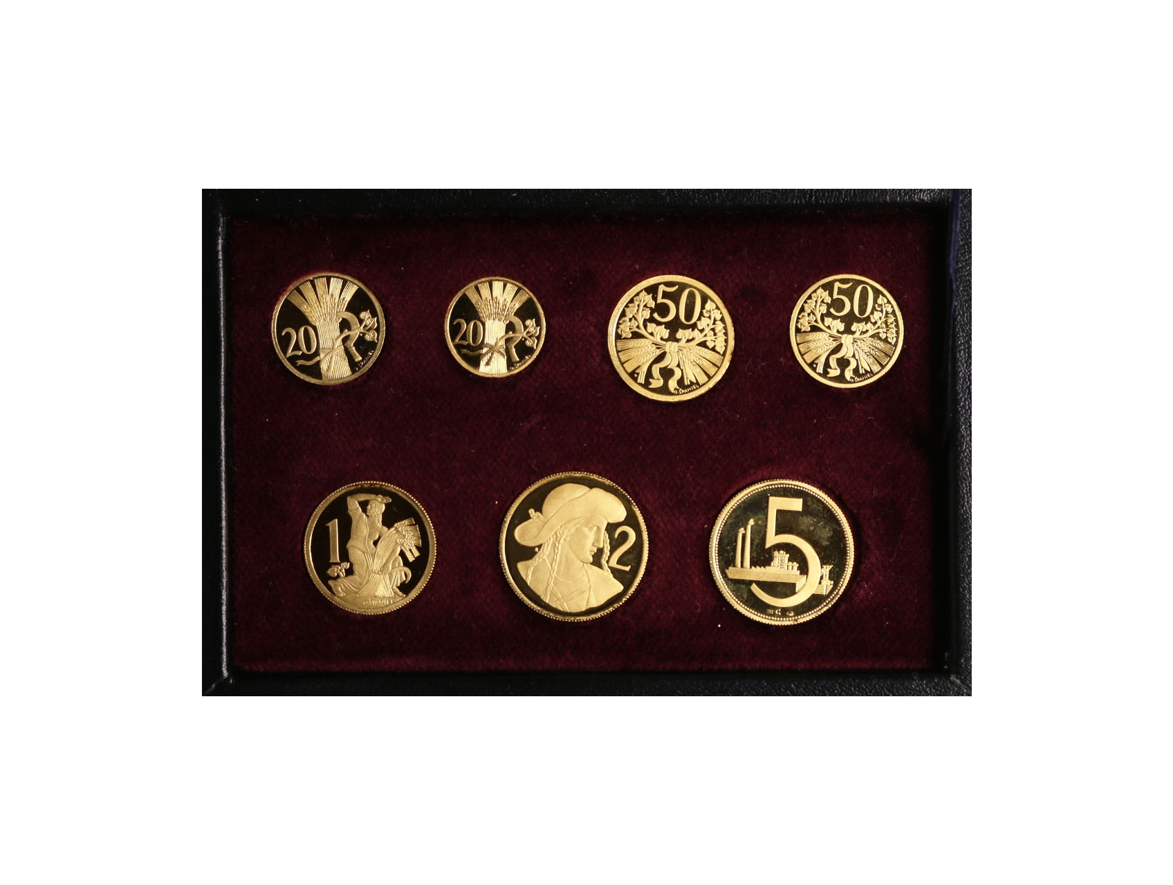 Česká Republika 1993 - sada 7 ks medailí "zlaté repliky oběhových mincí ČSR II. 1945 - 1953", Au 986, celkem 28,6 g, náklad 40 ks, etue, kvalita proof, certifikát