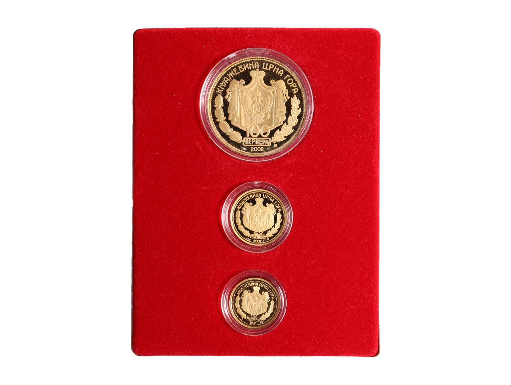 Černá Hora - sada 3 ks mincí 100, 20 a 10 Perper 2002, Au 900, celkem 44,05g, náklad 200 ks, etue, kvalita proof, certifikát č. 0058