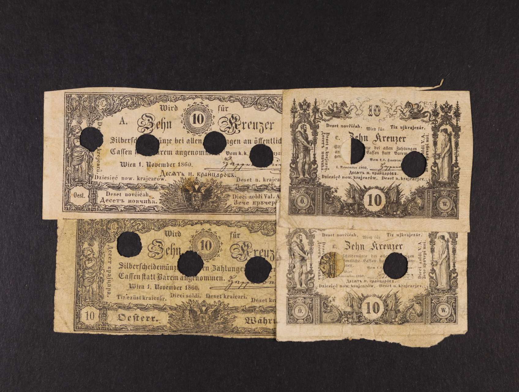 1684 10 Kreuzer 1.11.1860 4ks se 2 až 4-mi skartačnímy otvory, Ri. 133, 134, 135 (2x) 500