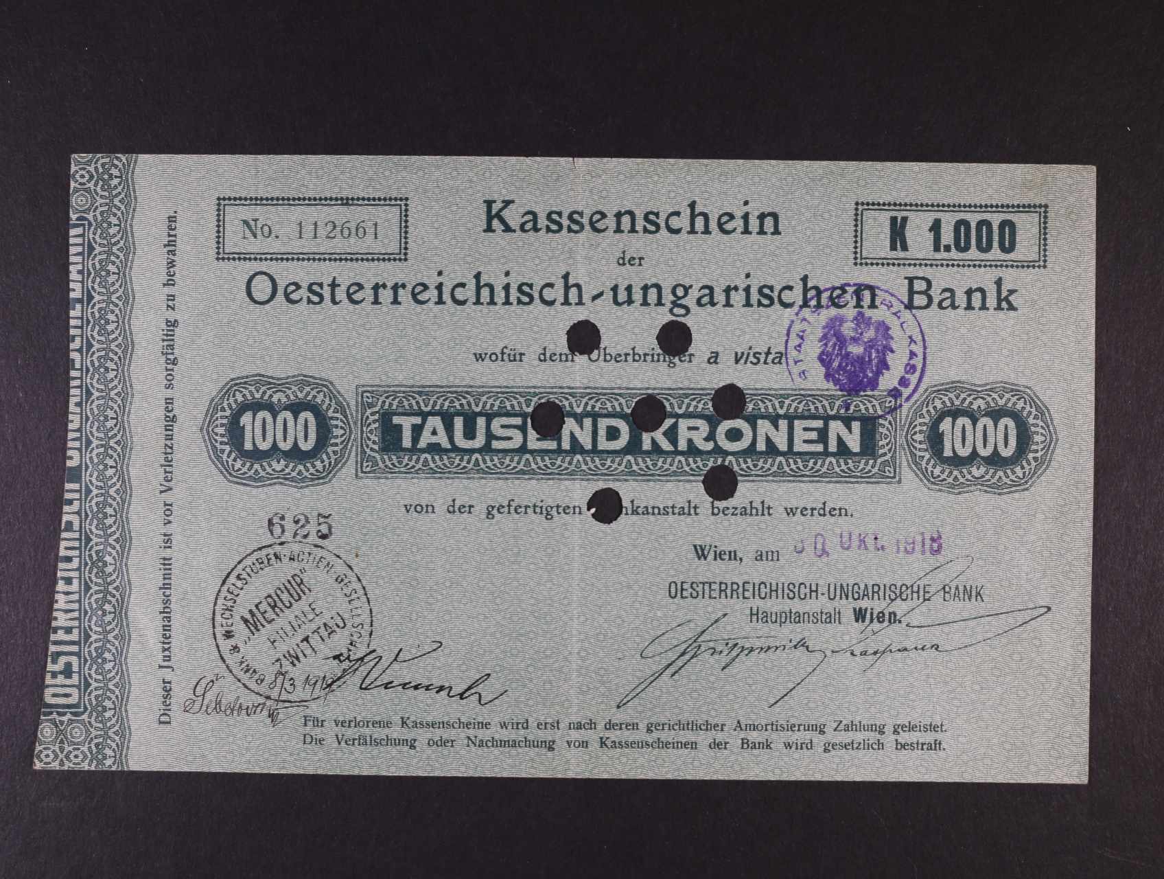 1000 K 1918 Kassenscheine "a vista", s bankovními raz. a perf. 7x otvor, Ri. 173a1, vzácný