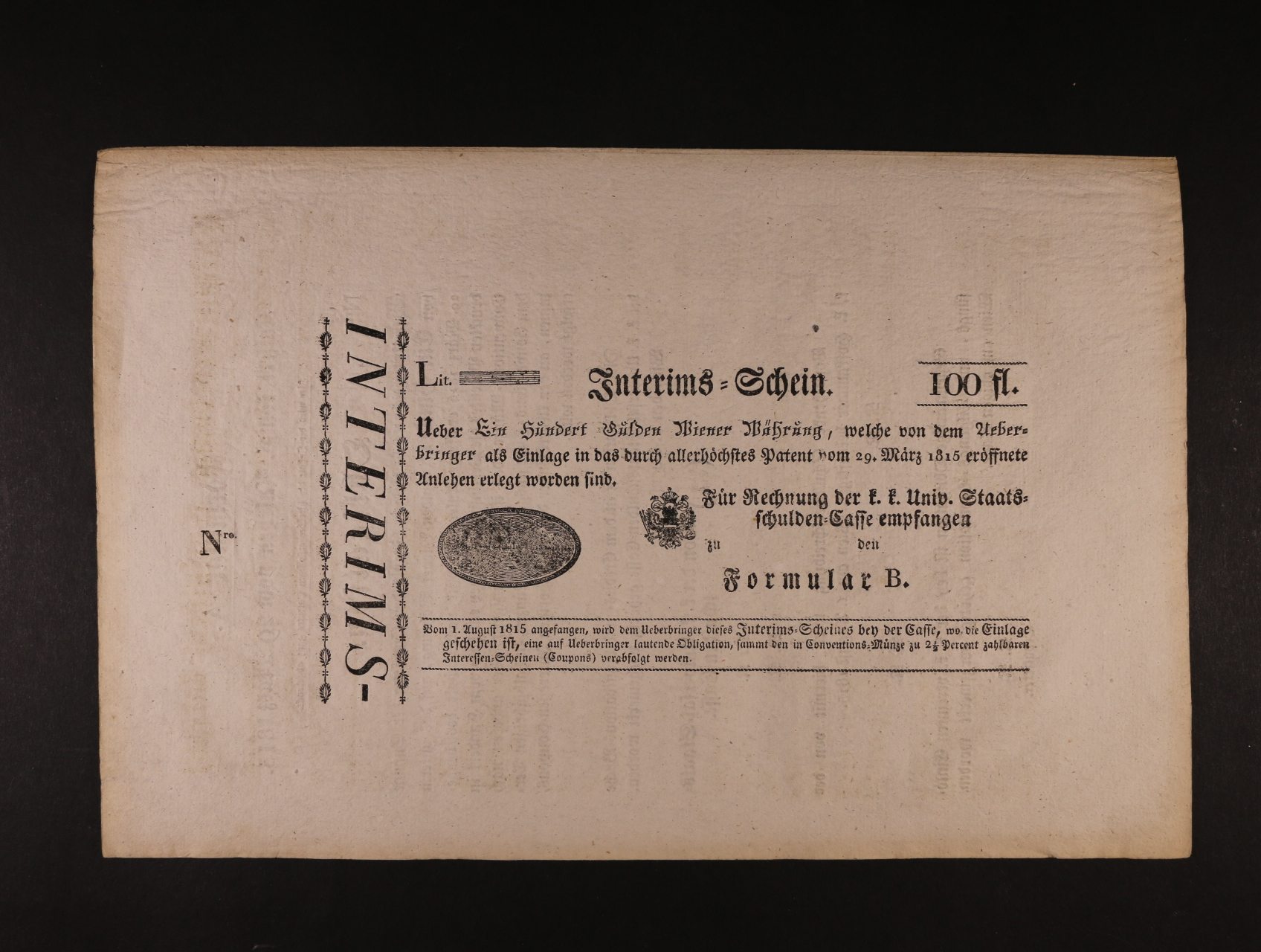 Interimsscheine (Zatímné wyswědčení), cirkulář včetně formuláře na 100 Gulden W.W. b.d., Ri. W22