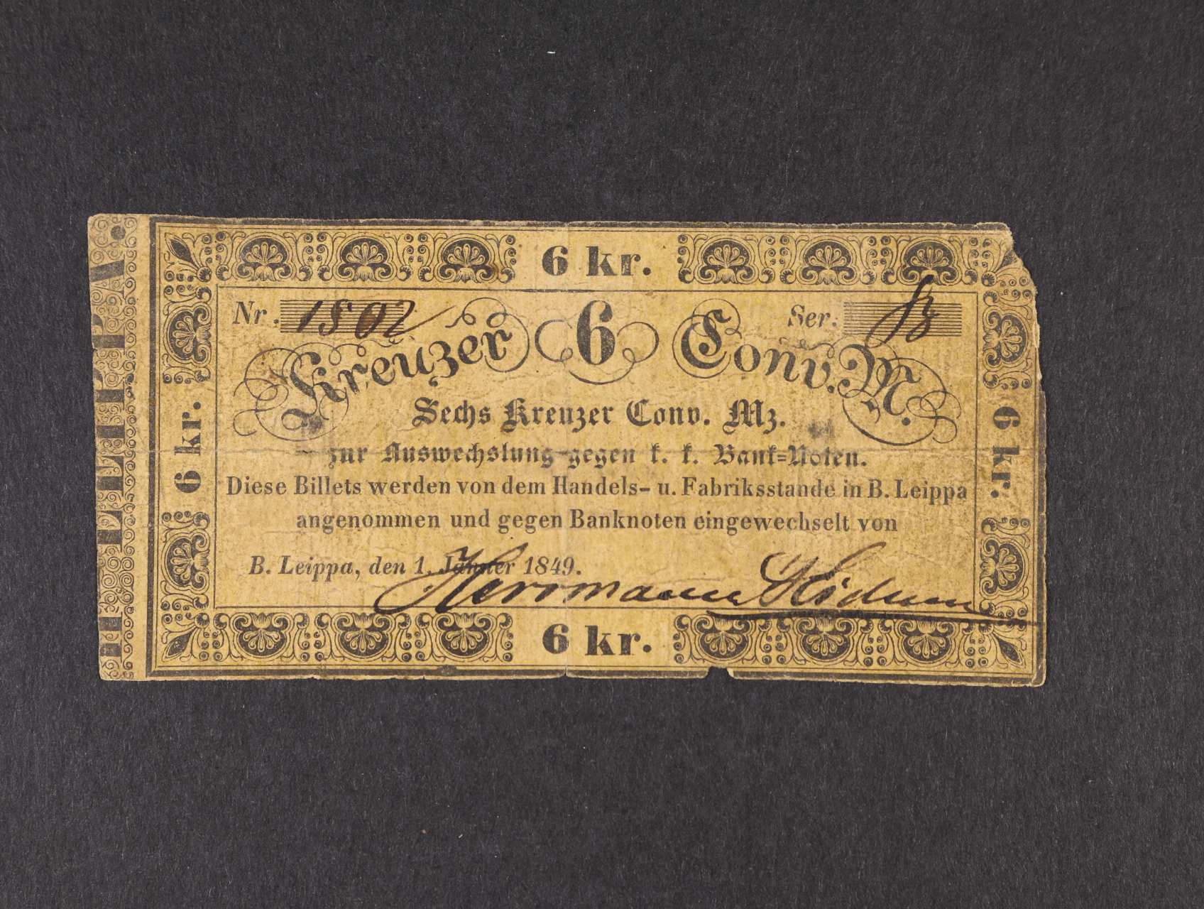 Böhm. Leippa (Česká Lípa), 6 kr. C.M. 1.1.1849 Herrmanns Eidam, oběhová, V.R. 115.20.02.O