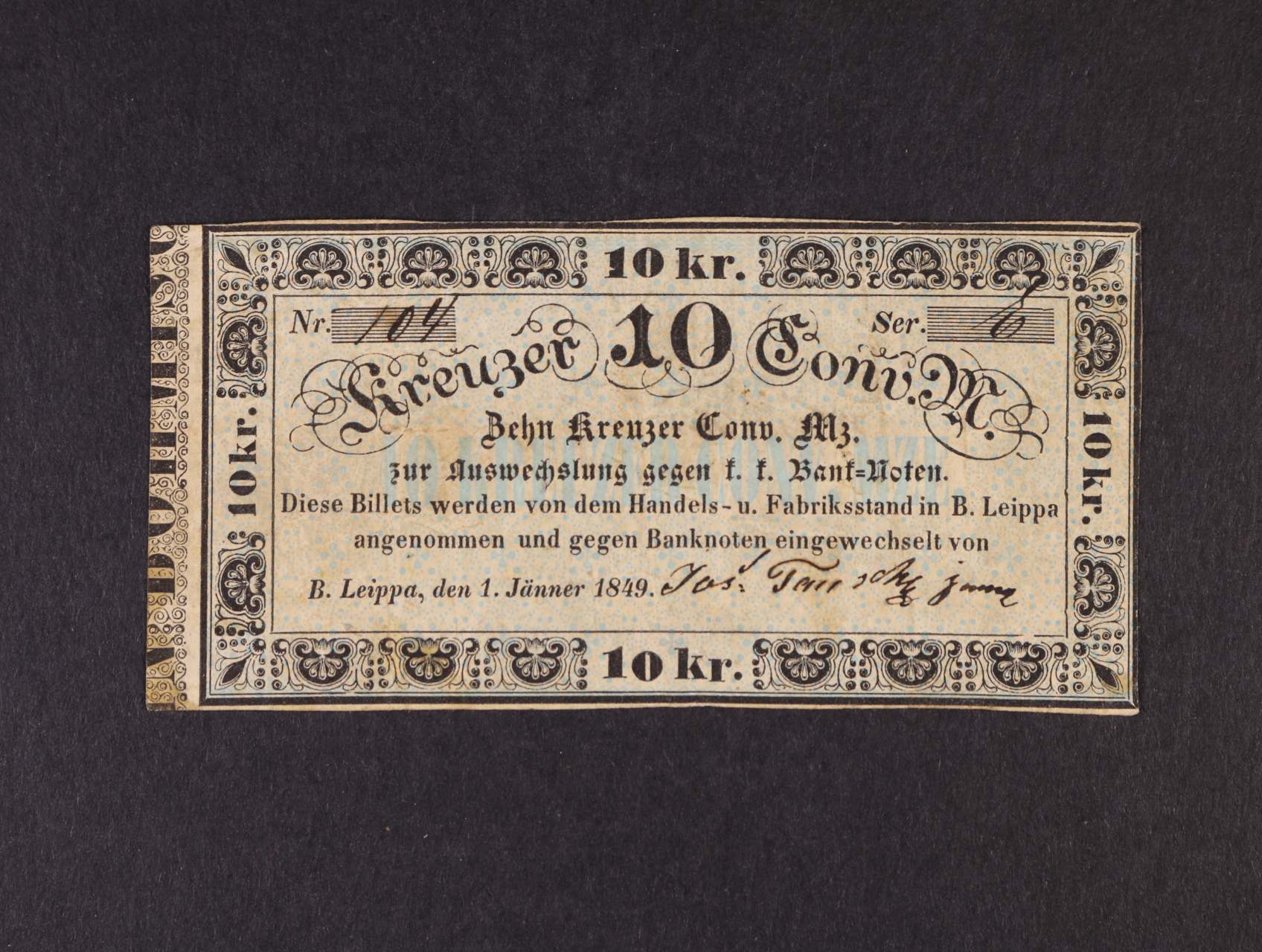 Böhm. Leippa (Česká Lípa), 10 kr. C.M. 1.1.1849 Jos. Tausch junior, oběhová, V.R. 115.36.03.O