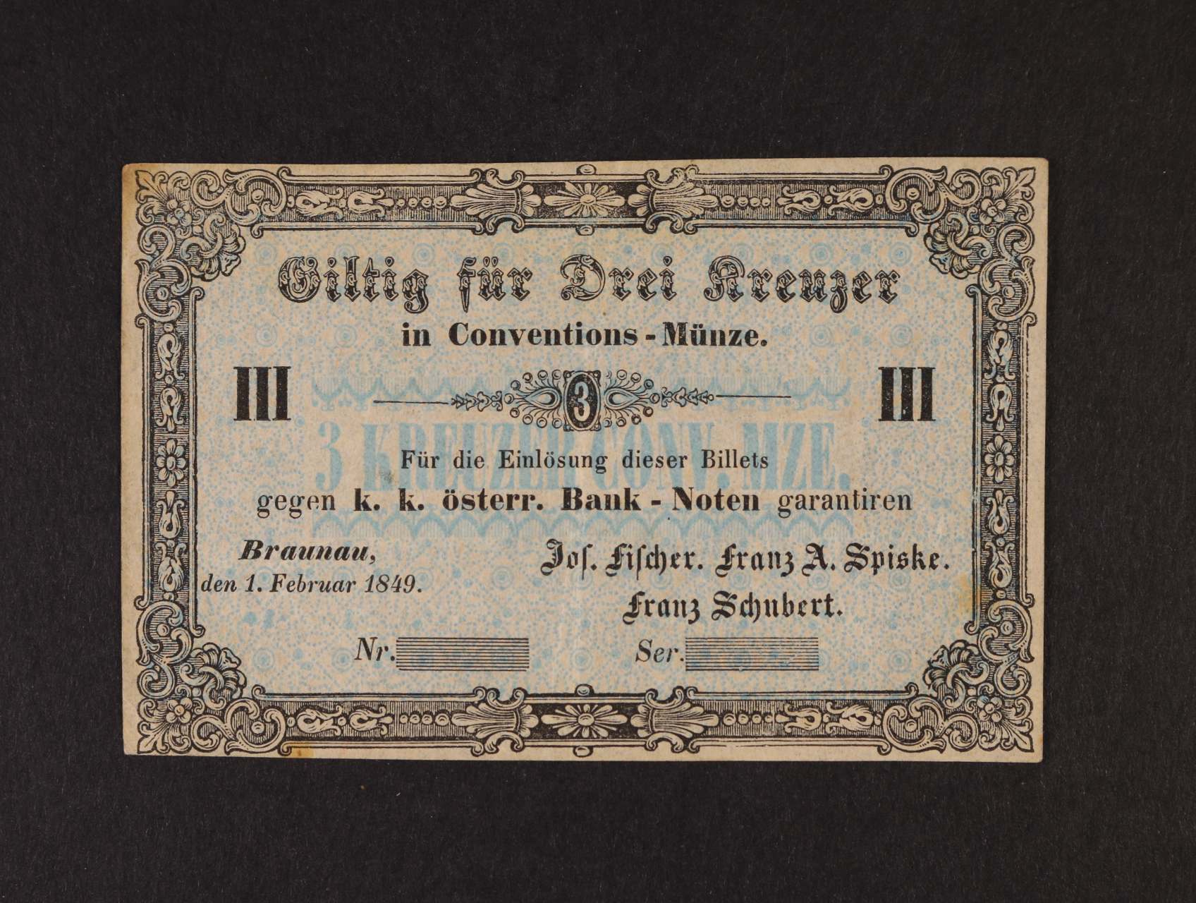 Braunau (Broumov), 3 kr C.M. 1.2.1849 Jos. Fischer, formulář, V.R. 140.02.01.F