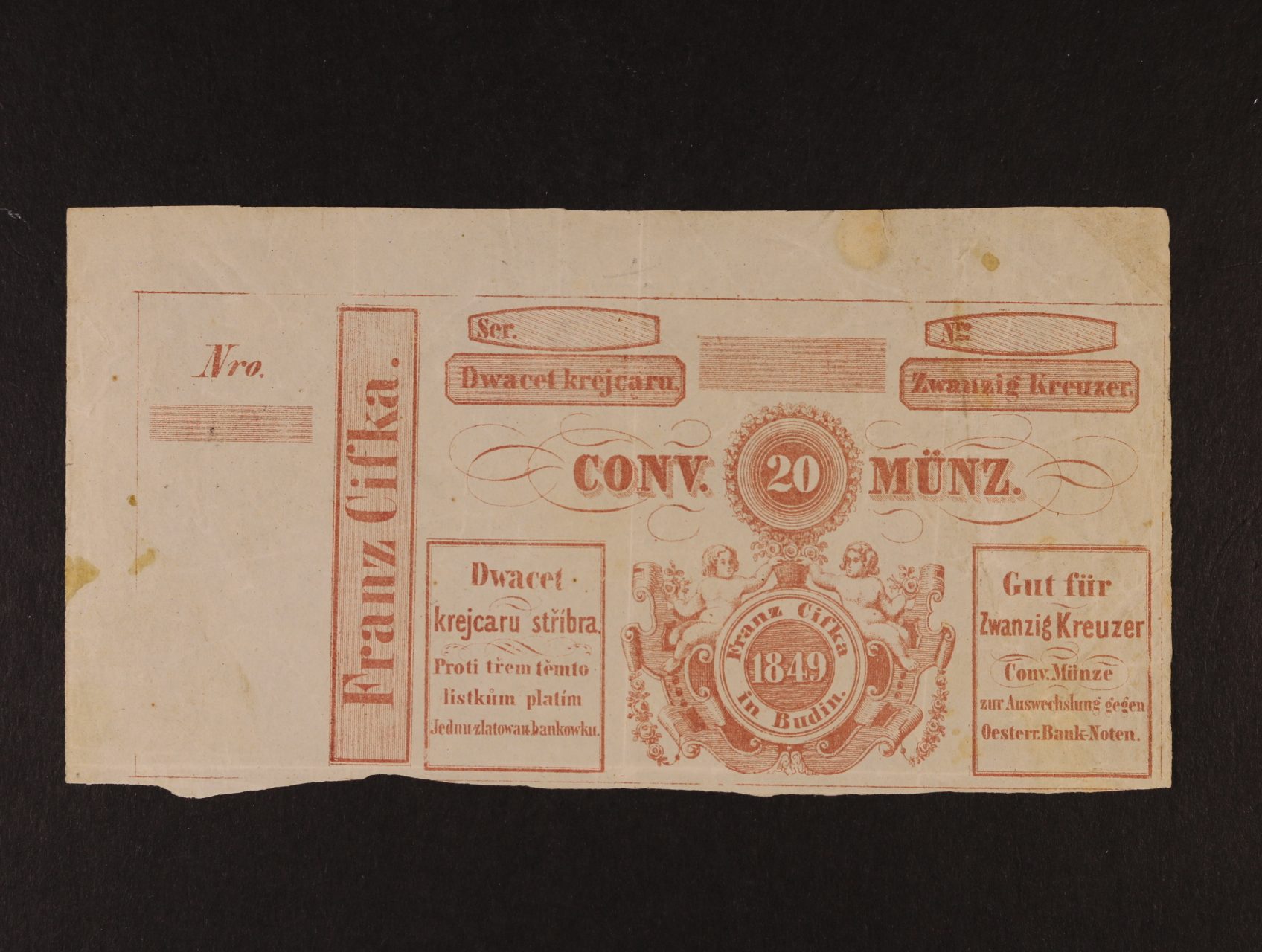 Budin (Budyně nad Ohří), 20 kr. C.M. 1849 Franz Cifka, formulář, V.R. 170.02.04.b.F